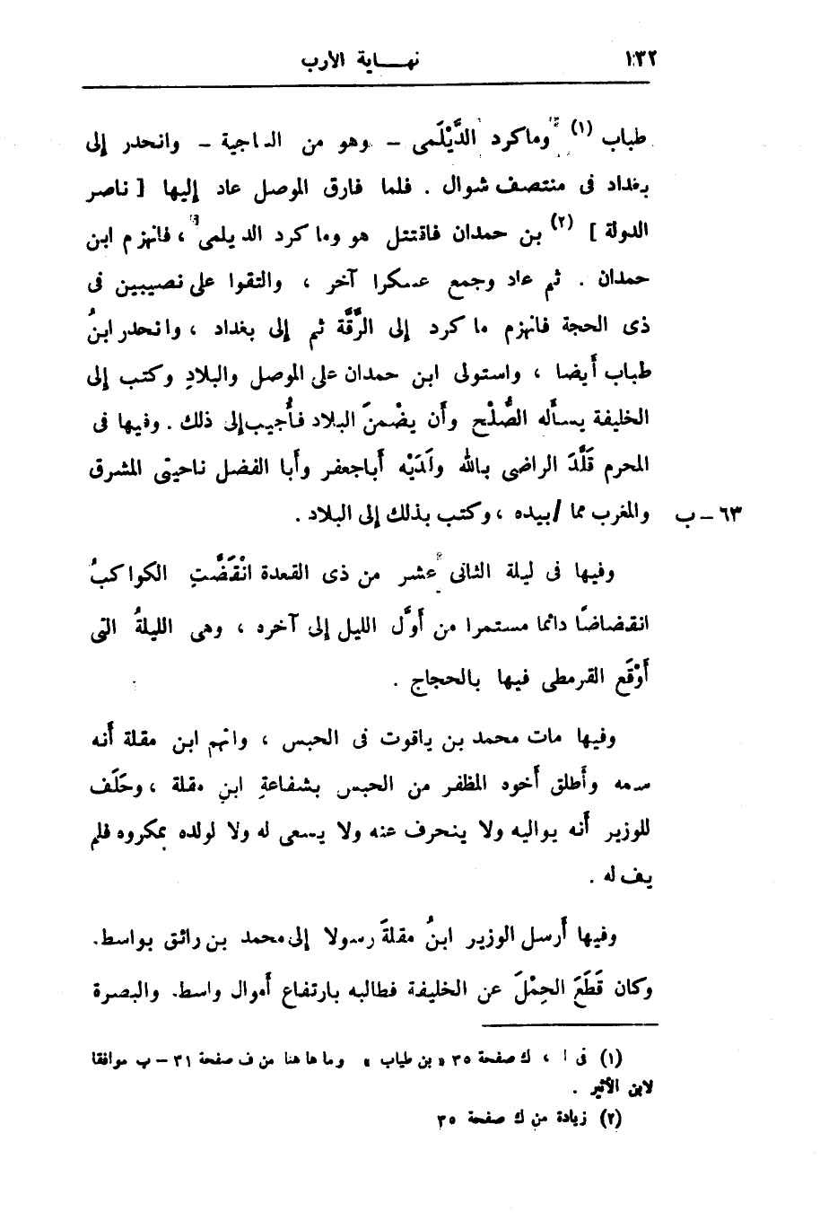 طباب «1» وما كرد الدّيلمى- وهو من الساجية- وانحدر إلى بغداد فى منتصف شوال. فلما فارق الموصل عاد إليها [ناصر الدولة] «2» بن حمدان فاقتتل هو وما كرد الديلمى، فانهزم ابن حمدان. ثم عاد وجمع عسكرا آخر، والتقوا على نصيبين فى ذى الحجة فانهزم ما كرد إلى الرّقّة ثم إلى بغداد، وانحدر ابن طباب أيضا، واستولى ابن حمدان على الموصل والبلاد وكتب إلى الخليفة يسأله الصّلح وأن يضمن البلاد فأجيب إلى ذلك. وفيها فى المحرم قلّد الراضى بالله ولديه أبا جعفر وأبا الفضل ناحيتى المشرق والمغرب مما/ بيده، وكتب بذلك إلى البلاد.
