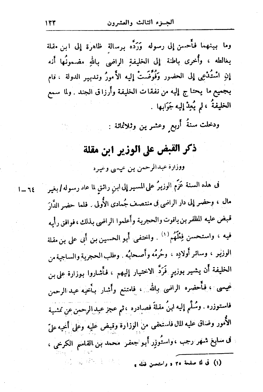 وما بينهما فأحسن إلى رسوله وردّه برسالة ظاهرة إلى ابن مقلة يغالطه، وأخرى باطنة إلى الخليفة الراضى بالله مضمونها أنه إن استدعى إلى الحضور وفوّضت إليه الأمور وتدبير الدولة، فام بجميع ما يحتاج إليه من نفقات الخليفة وأرزاق الجند. ولما سمع الخليفة، لم يعد إليه جوابها.