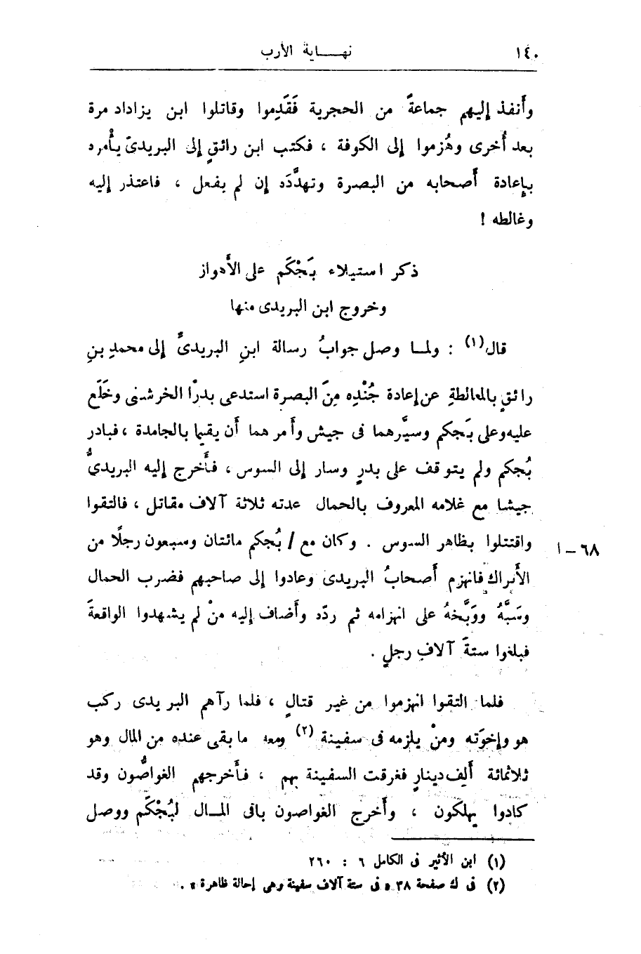 فلما التقوا انهزموا من غير قتال، فلما رآهم البريدى ركب هو وإخوته ومن يلزمه فى سفينة «2» ومعه ما بقى عنده من المال وهو ثلاثمائة ألف دينار فغرقت السفينة بهم، فأخرجهم الغواصّون وقد كادوا يهلكون، وأخرج الغواصون باقى المال لبجكم ووصل