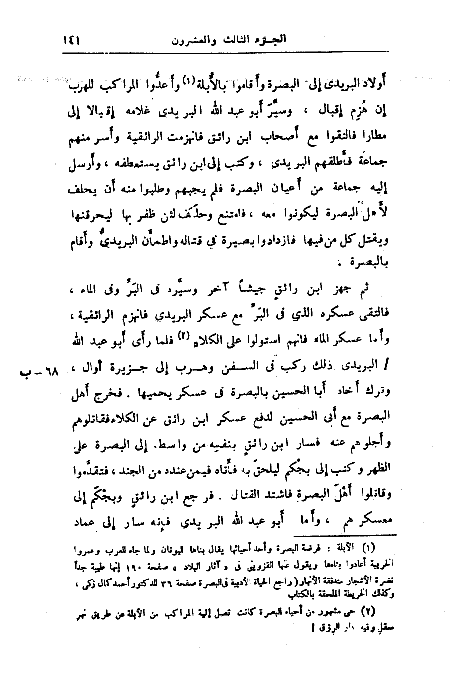 ثم جهز ابن رائق جيشا آخر وسيّره فى البرّ وفى الماء، فالتقى عسكره الذى فى البرّ مع عسكر البريدى فانهزم الرائقية، وأما عسكر الماء فانهم استولوا على الكلاء «2» فلما رأى أبو عبد الله/ البريدى ذلك ركب فى السفن وهرب إلى جزيرة أوال، وترك أخاه أبا الحسين بالبصرة فى عسكر يحميها. فخرج أهل البصرة مع أبى الحسين لدفع عسكر ابن رائق عن الكلاء فقاتلوهم وأجلوهم عنه فسار ابن رائق بنفسه من واسط إلى البصرة على الظهر وكتب إلى بجكم ليلحق به فأتاه فيمن عنده من الجند، فتقدّموا وقاتلوا أهل البصرة فاشتد القتال. فرجع ابن رائق وبجكم إلى معسكرهم، وأما أبو عبد الله البريدى فإنه سار إلى عماد