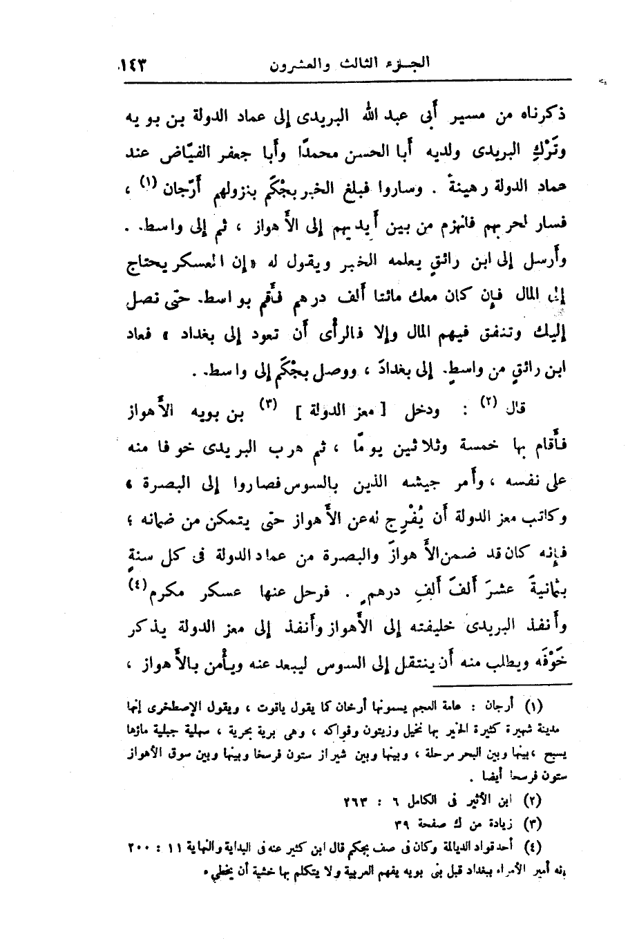 قال «2» : ودخل [معز الدولة] «3» بن بويه الأهواز فأقام بها خمسة وثلاثين يوما، ثم هرب البريدى خوفا منه على نفسه، وأمر جيشه الذين بالسوس فصاروا إلى البصرة، وكاتب معز الدولة أن يفرج له عن الأهواز حتى يتمكن من ضمانه؛ فإنه كان قد ضمن الأهواز والبصرة من عماد الدولة فى كل سنة بثمانية عشر ألف ألف درهم. فرحل عنها عسكر مكرم «4» وأنفذ البريدى خليفته إلى الأهواز وأنفذ إلى معز الدولة يذكر خوفه ويطلب منه أن ينتقل إلى السوس ليبعد عنه ويأمن بالأهواز،
