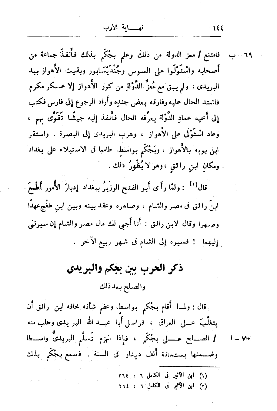 والصلح بعد ذلك قال: «2» ولما أقام بجكم بواسط وعظم شأنه خافه ابن رائق أن يتغلّب على العراق، فراسل أبا عبد الله البريدى وطلب منه/ الصلح على بجكم، فإذا انهزم تسلّم البريدىّ واسطا وضمنها بستمائة ألف دينار فى السنة. فسمع بجكم بذلك