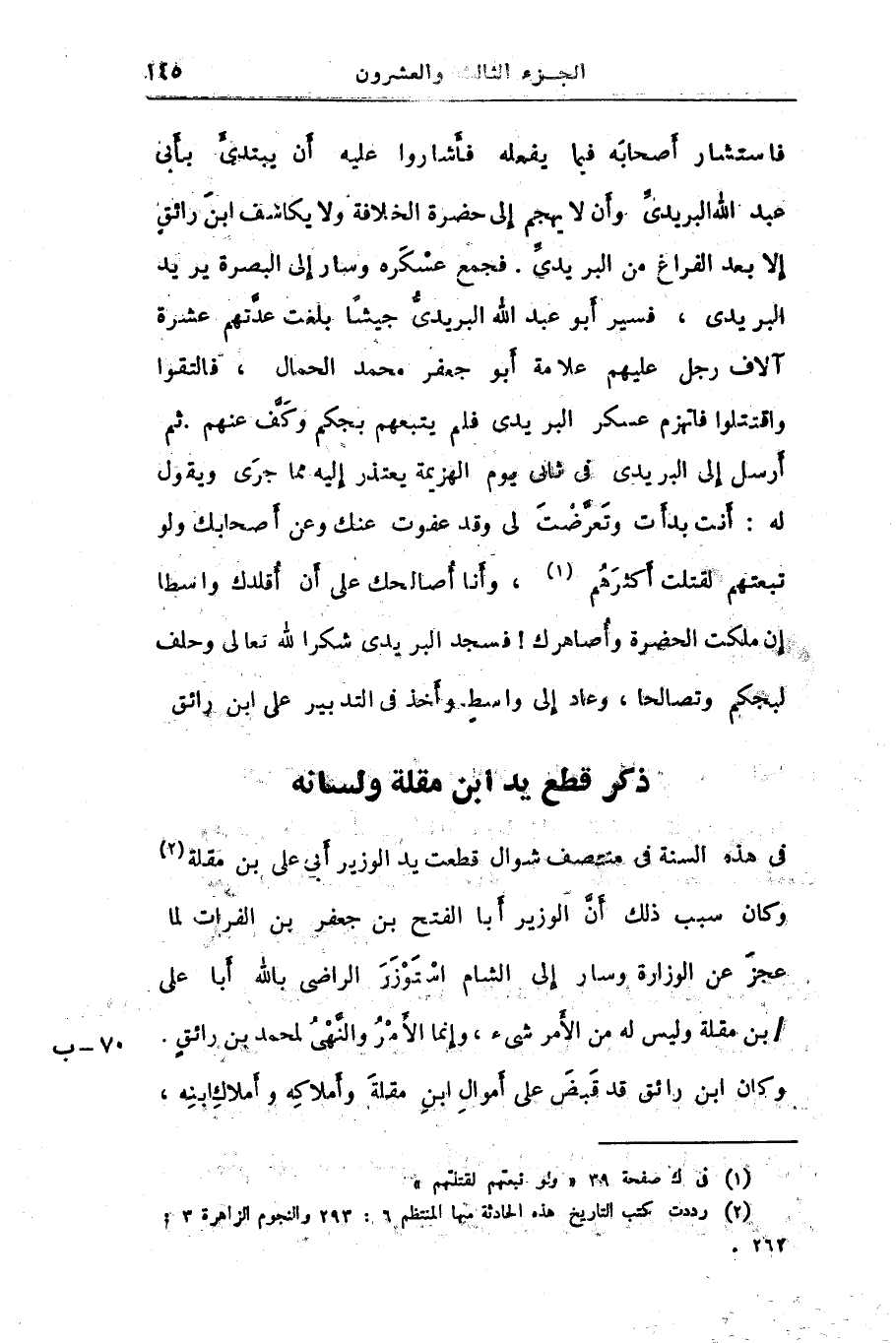 فى هذه السنة فى منتصف شوال قطعت يد الوزير أبى على بن مقلة «2» وكان سبب ذلك أنّ الوزير أبا الفتح بن جعفر بن الفرات لما عجز عن الوزارة وسار إلى الشام استوزر الراضى بالله أبا على/ بن مقلة وليس له من الأمر شىء، وإنما الأمر والنّهى لمحمد بن رائق.
