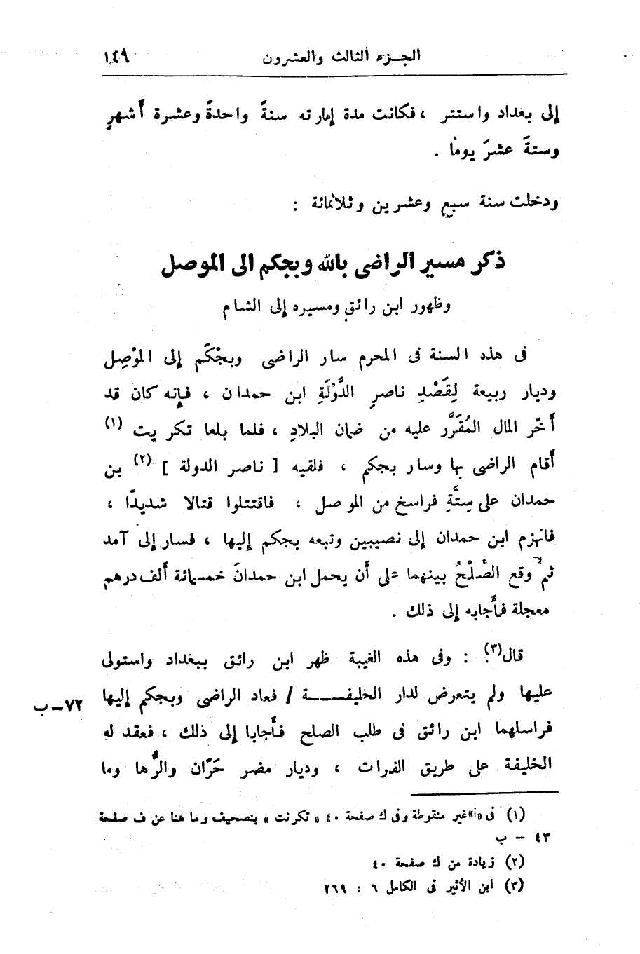 فى هذه السنة فى المحرم سار الراضى وبجكم إلى الموصل وديار ربيعة لقصد ناصر الدّولة ابن حمدان، فإنه كان قد أخّر المال المقرّر عليه من ضمان البلاد، فلما بلعا تكريت «1» أقام الراضى بها وسار بجكم، فلقيه [ناصر الدولة] «2» بن حمدان على ستّة فراسخ من الموصل، فاقتتلوا قتالا شديدا، فانهزم ابن حمدان إلى نصيبين وتبعه بجكم إليها، فسار إلى آمد ثم وقع الصّلح بينهما على أن يحمل ابن حمدان خمسمائة ألف درهم معجلة فأجابه إلى ذلك.