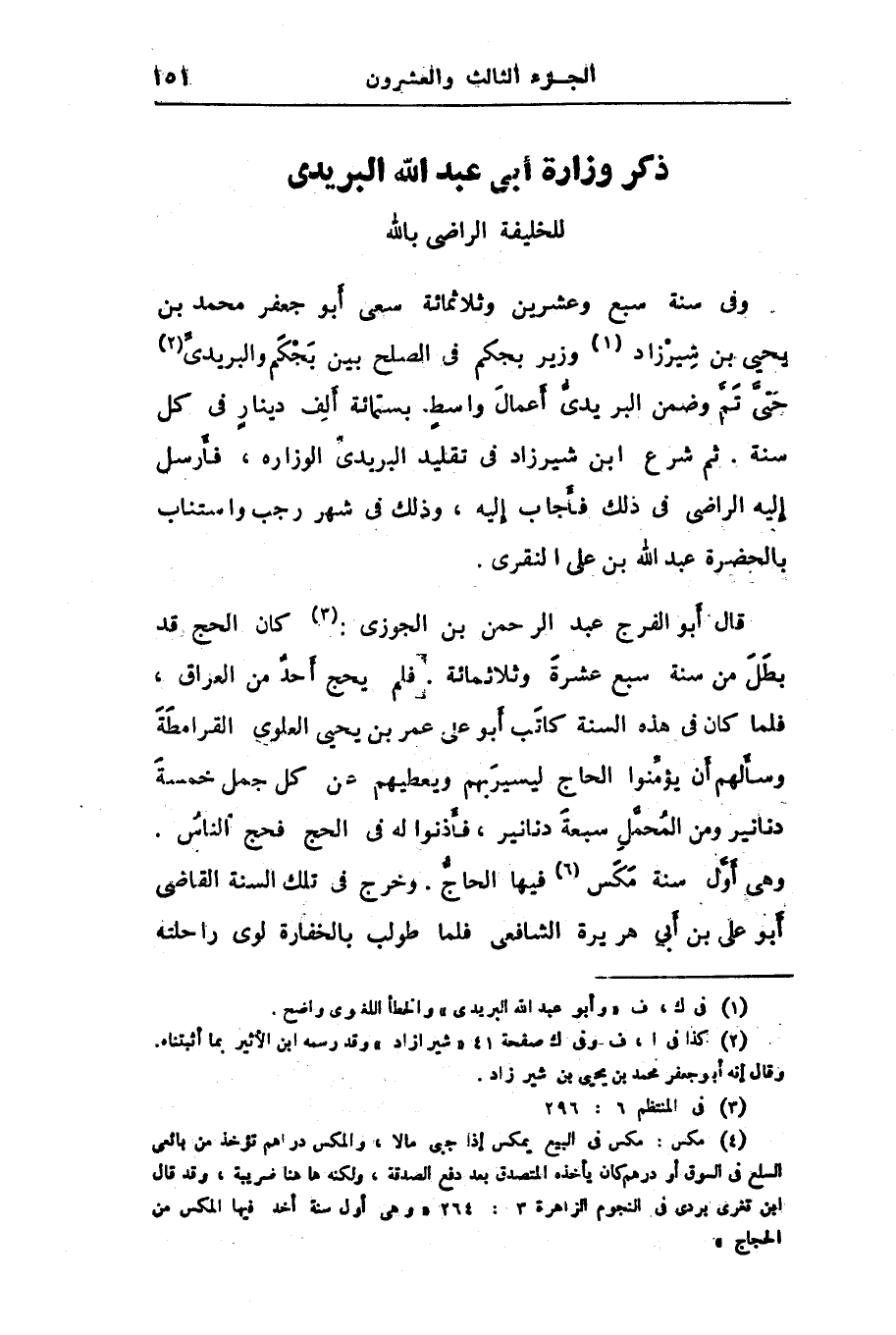 للخليفة الراضى بالله وفى سنة سبع وعشرين وثلاثمائة سعى أبو جعفر محمد بن يحيى بن شيرزاد «1» وزير بجكم فى الصلح بين بجكم والبريدىّ «2» حتّى تمّ وضمن البريدىّ أعمال واسط بستمائة ألف دينار فى كل سنة. ثم شرع ابن شيرزاد فى تقليد البريدىّ الوزاره، فأرسل إليه الراضى فى ذلك فأجاب إليه، وذلك فى شهر رجب واستناب بالحضرة عبد الله بن على النقرى.