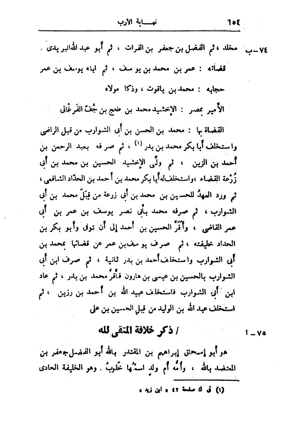 قضائه: عمر بن محمد بن يوسف، ثم ابنه يوسف بن عمر حجابه: محمد بن ياقوت، وذكا مولاه الأمير بمصر: الإخشيد محمد بن طعج بن جفّ الفرغانى القضاة بها: محمد بن الحسن بن أبى الشوارب من قبل الراضى واستخلف أبا بكر محمد بن بدر «1» ، ثم صرفه بعبد الرحمن بن أحمد بن الزين، ثم ولّى الإخشيد الحسين بن محمد بن أبى زرعة القضاء، واستخلف له أبا بكر محمد بن أحمد بن الحدّاد الشافعى، ثم ورد العهد للحسين بن محمد بن أبى زرعة من قبل محمد بن أبى الشوارب، ثم صرفه محمد بأبى نصر يوسف بن عمر بن أبى عمر القاضى، وأقرّ الحسين بن أحمد إلى أن توفى وأبو بكر بن الحداد خليفته، ثم صرف يوسف بن عمر عن قضائها بمحمد بن أبى الشوارب واستخلف أحمد بن بدر ثانية، ثم صرف ابن أبى الشوارب بالحسين بن عيسى بن هارون فأقرّ محمد بن بدر، ثم عاد ابن أبى الشوارب فاستخلف عبيد الله بن أحمد بن رزين، ثم استخلف عبد الله بن الوليد من قبل الحسين بن على