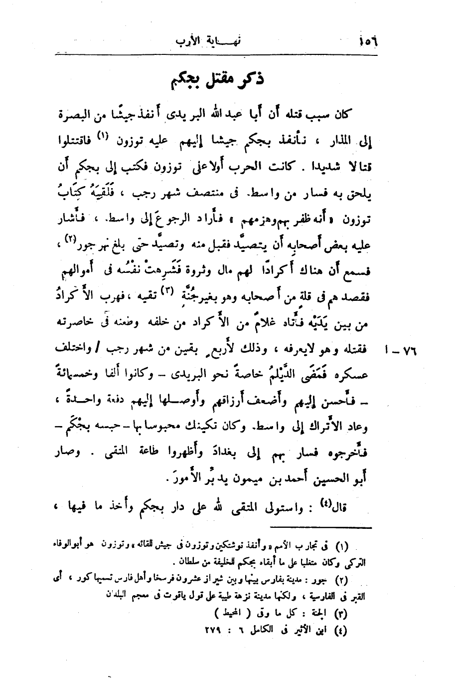 كان سبب قتله أن أبا عبد الله البريدى أنفذ جيشا من البصرة إلى المذار، فأنفذ بجكم جيشا إليهم عليه توزون «1» فاقتتلوا قتالا شديدا. كانت الحرب أولا على توزون فكتب إلى بجكم أن يلحق به فسار من واسط فى منتصف شهر رجب، فلقيه كتاب توزون «أنه ظفر بهم وهزمهم» فأراد الرجوع إلى واسط، فأشار عليه بعض أصحابه أن يتصيّد فقبل منه وتصيّد حتى بلغ نهر جور «2» ، فسمع أن هناك أكرادا لهم مال وثروة فشرهت نفسه فى أموالهم فقصدهم فى قلة من أصحابه وهو بغير جنّة «3» تقيه، فهرب الأكراد من بين يديه فأتاه غلام من الأكراد من خلفه وطعنه فى خاصرته فقتله وهو لا يعرفه، وذلك لأربع بقين من شهر رجب/ واختلف عسكره فمضى الدّيلم خاصة نحو البريدى- وكانوا ألفا وخمسمائة- فأحسن إليهم وأضعف أرزاقهم وأوصلها إليهم دفعة واحدة، وعاد الأتراك إلى واسط وكان تكينك محبوسا بها- حبسه بجكم- فأخرجوه فسار بهم إلى بغداد وأظهروا طاعة المتقى. وصار أبو الحسين أحمد بن ميمون يدبّر الأمور.