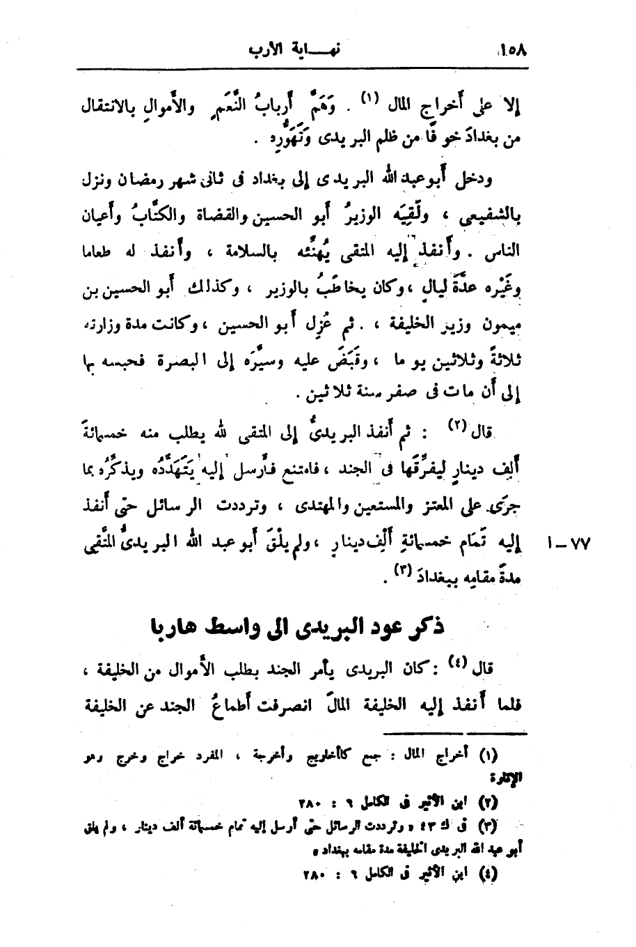 قال «2» : ثم أنفذ البريدىّ إلى المتقى لله يطلب منه خمسمائة ألف دينار ليفرّقها فى الجند، فامتنع فأرسل إليه يتهدّده ويذكّره بما جرى على المعتز والمستعين والمهتدى، وترددت الرسائل حتى أنفذ إليه تمام خمسمائة ألف دينار، ولم يلق أبو عبد الله البريدىّ المتّقى مدة مقامه ببغداد «3» .