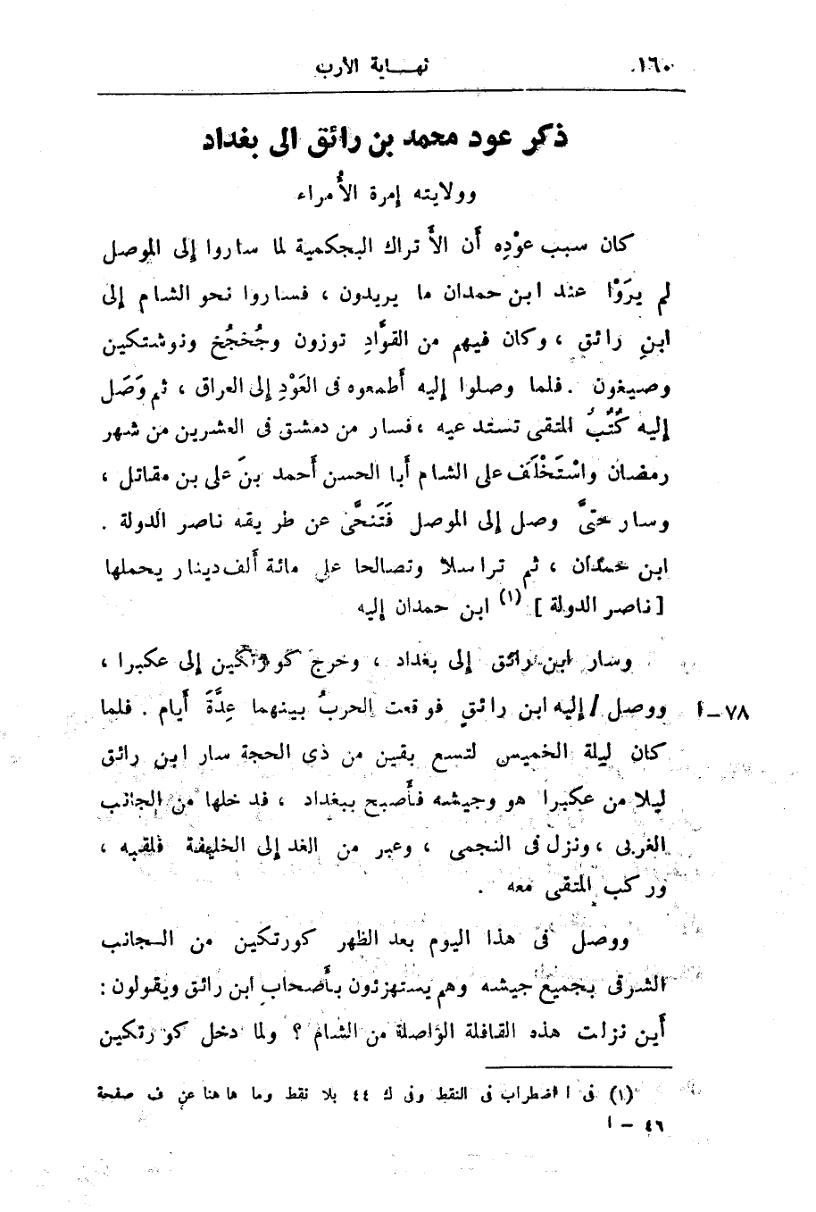 وسار ابن رائق إلى بغداد، وخرج كورتكين إلى عكبرا، ووصل/ إليه ابن رائق فوقعت الحرب بينهما عدّة أيام. فلما كان ليلة الخميس لتسع بقين من ذى الحجة سار ابن رائق ليلا من عكبرا هو وجيشه فأصبح ببغداد، فدخلها من الجانب الغربى، ونزل فى النجمى، وعبر من الغد إلى الخليفة فلقبه، وركب المتقى معه.