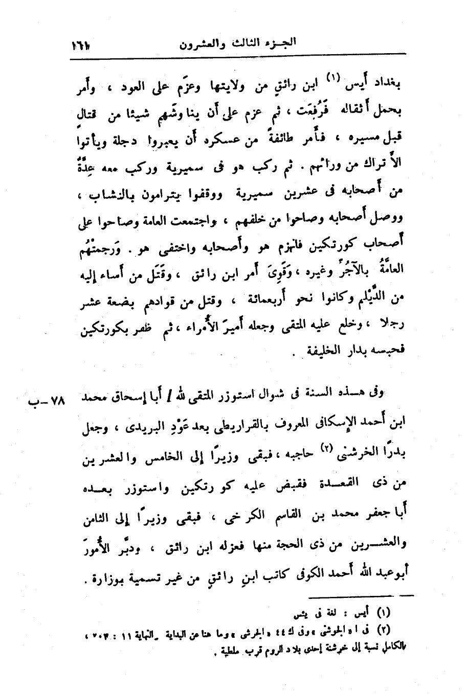 بغداد أيس «1» ابن رائق من ولايتها وعزم على العود، وأمر بحمل أثقاله فرفعت، ثم عزم على أن يناوشهم شيئا من قتال قبل مسيره، فأمر طائفة من عسكره أن يعبروا دجلة ويأتوا الأتراك من ورائهم. ثم ركب هو فى سميرية وركب معه عدّة من أصحابه فى عشرين سميرية ووقفوا يترامون بالنشاب، ووصل أصحابه وصاحوا من خلفهم، واجتمعت العامة وصاحوا على أصحاب كورتكين فانهزم هو وأصحابه واختفى هو. ورجمتهم العامّة بالآجرّ وغيره، وقوى أمر ابن رائق، وقتل من أساء إليه من الدّيلم وكانوا نحو أربعمائة، وقتل من قوادهم بضعة عشر رجلا، وخلع عليه المتقى وجعله أمير الأمراء، ثم ظفر بكورتكين فحبسه بدار الخليفة.