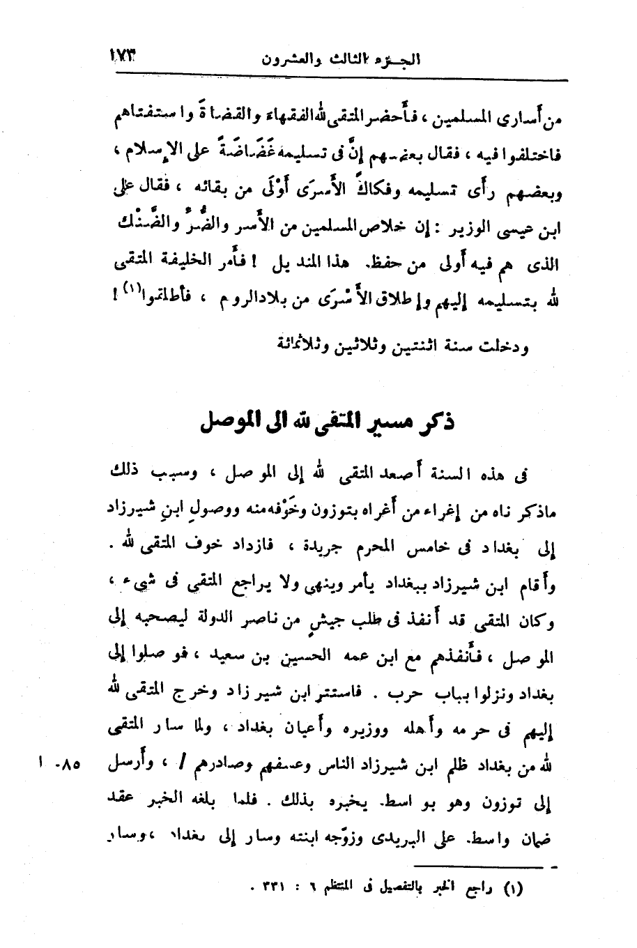 من أسارى المسلمين، فأحضر المتقى لله الفقهاء والقضاة واستفتاهم فاختلفوا فيه، فقال بعضهم إنّ فى تسليمه غضاضة على الإسلام، وبعضهم رأى تسليمه وفكاك الأسرى أولى من بقائه، فقال على ابن عيسى الوزير: إن خلاص المسلمين من الأسر والضّرّ والضّنك الذى هم فيه أولى من حفظ هذا المنديل! فأمر الخليفة المتقى لله بتسليمه إليهم وإطلاق الأسرى من بلاد الروم، فأطلقوا «1» ! ودخلت سنة اثنتين وثلاثين وثلاثمائة