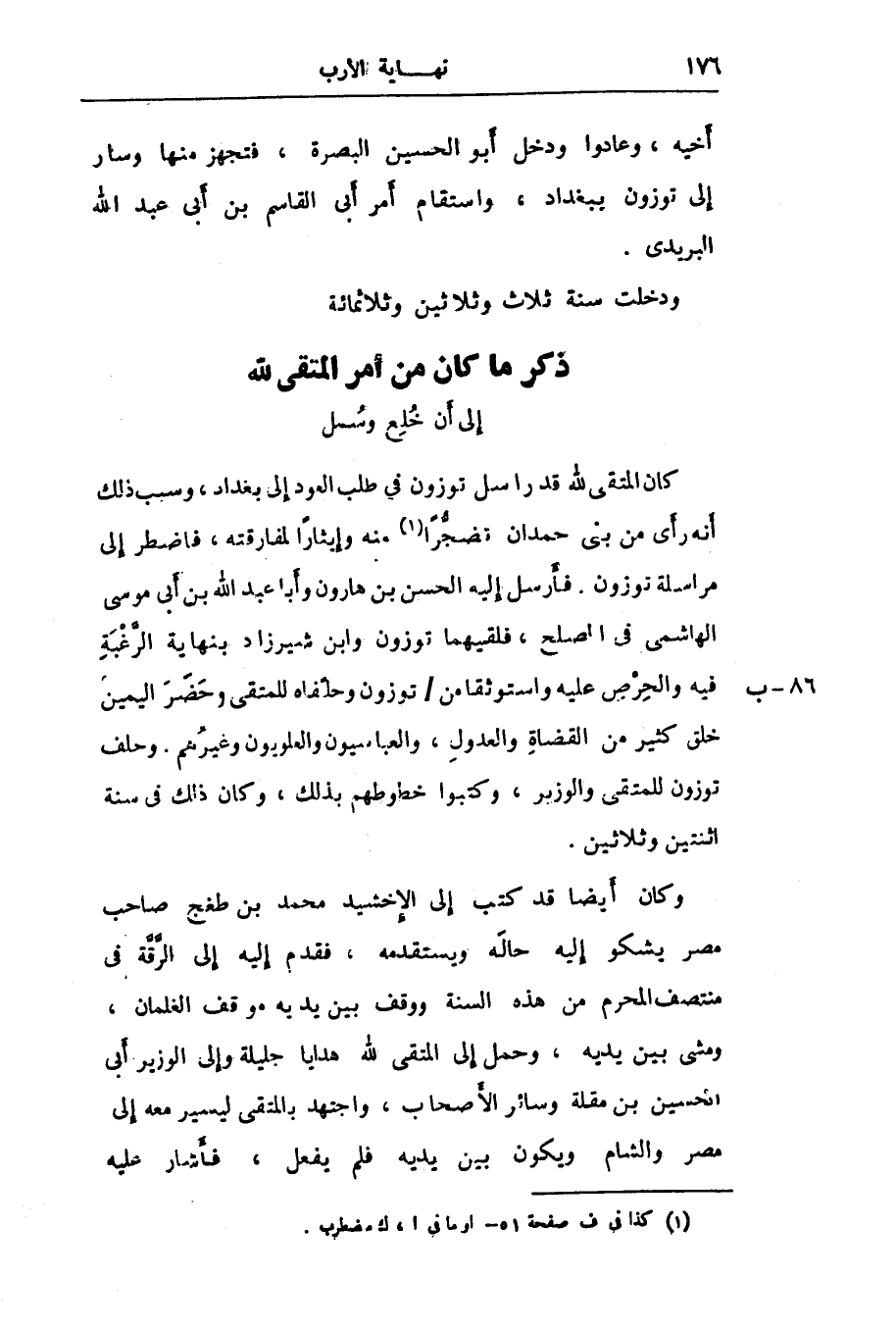 كان المتقى لله قد راسل توزون فى طلب العود إلى بغداد، وسبب ذلك أنه رأى من بنى حمدان تضجّرا «1» منه وإيثارا لمفارقته، فاضطر إلى مراسلة توزون. فأرسل إليه الحسن بن هارون وأبا عبد الله بن أبى موسى الهاشمى فى الصلح، فلقيهما توزون وابن شيرزاد بنهاية الرّغبة فيه والحرص عليه واستوثقا من/ توزون وحلّفاه للمتقى وحضر اليمين خلق كثير من القضاة والعدول، والعباسيون والعلويون وغيرهم. وحلف توزون للمتقى والوزير، وكتبوا خطوطهم بذلك، وكان ذلك فى سنة اثنتين وثلاثين.
