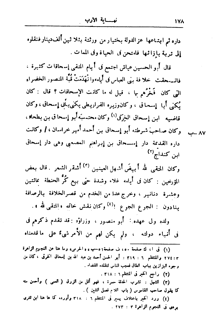 قال أبو الحسين عياش اجتمع فى أيام المتقى إسحاقات كثيرة، فانسحقت خلافة بنى العباس فى أيامه وانهدمت قبّة المنصور الخضراء التى كان فخرهم بها، قيل له ما كانت الإسحاقات؟ قال: كان يكنى أبا إسحاق، وكان وزيره القراريطى يكنى بأبى إسحاق، وكان قاضيه ابن إسحاق الخرقى «1» وكان محتسبه أبو إسحاق بن بطحاء، وكان صاحب شرطته أبو إسحاق بن أحمد أمير خراسان،/ وكانت داره القديمة دار إسحاق بن إبراهيم المعصبى وهى دار إسحاق ابن كنداج «2» وكان المتقى لله أبيض أشهل العينين «3» أشقر الشعر. قال بعض المؤرخين: كان فى أيامه غلاء وشدة حتى بيع كرّ الحنطة بمائتين وعشرة دنانير، وخرج عدة من الخدم من قصر الخلافة بالرصافة ينادون: الجوع الجوع! «4» وكان نقش خاتمه «المتقى لله» .