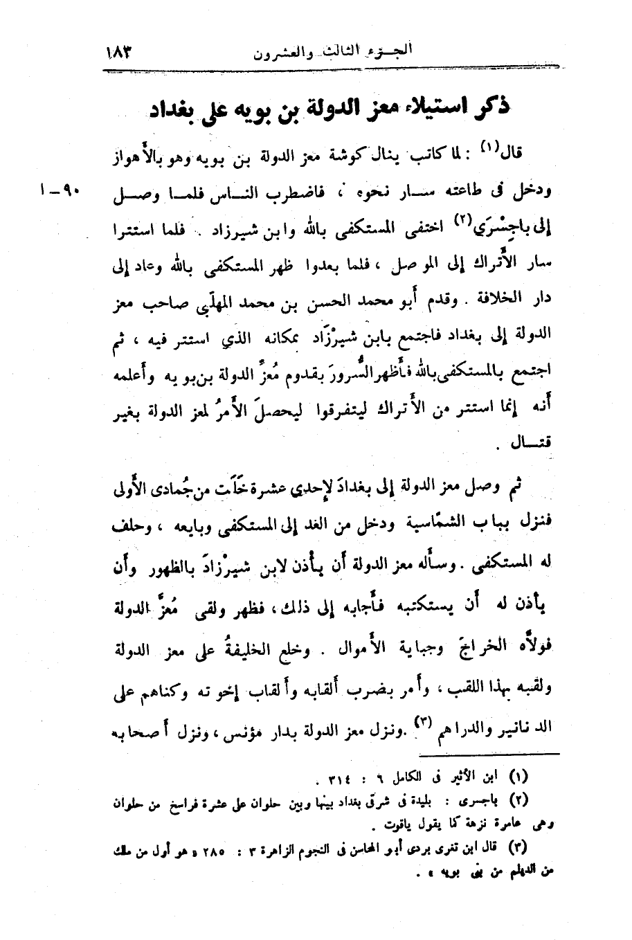 ثم وصل معز الدولة إلى بغداد لإحدى عشرة خلت من جمادى الأولى فنزل بباب الشمّاسية ودخل من الغد إلى المستكفى وبايعه، وحلف له المستكفى. وسأله معز الدولة أن يأذن لابن شيرزاد بالظهور وأن يأذن له أن يستكتبه فأجابه إلى ذلك، فظهر ولقى معزّ الدولة فولّاه الخراج وجباية الأموال. وخلع الخليفة على معز الدولة ولقبه بهذا اللقب، وأمر بضرب ألقابه وألقاب إخوته وكناهم على الدنانير والدارهم «3» . ونزل معز الدولة بدار مؤنس، ونزل أصحابه