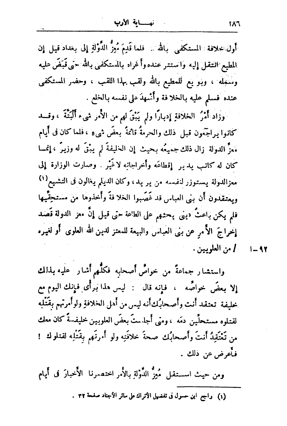 وزاد أمر الخلافة إدبارا ولم يبق لهم من الأمر شىء ألبتّة، وقد كانوا يراجعون قبل ذلك والحرمة قائمة بعض شىء، فلما كان فى أيام معزّ الدولة زال ذلك جميعه بحيث إن الخليفة لم يبق له وزير، إنما كان له كاتب يدير إقطاعه وأخراجاته لا غير. وصارت الوزارة إلى معز الدولة يستوزر لنفسه من يريد، وكان الديلم يغالون فى التشيع «1» ويعتقدون أن بنى العباس قد غصبوا الخلافة وأخذوها من مستحقّيها فلم يكن باعث دينى يحثهم على الطاعة حتى قيل إنّ معز الدولة قصد إخراج الأمر عن بنى العباس والبيعة للمعتز لدين الله العلوى أو لغيره/ من العلويين.