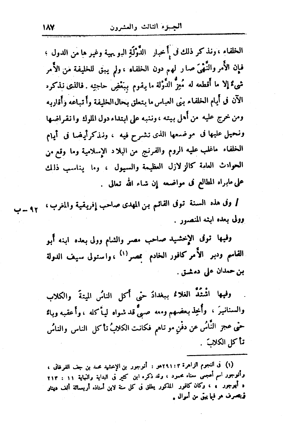 الخلفاء، ونذكر ذلك فى أخبار الدّولة البويهية وغيرها من الدول؛ فإن الأمر والنّهى صار لهم دون الخلفاء، ولم يبق للخليفة من الأمر شىء إلا ما أقطعه له معزّ الدّولة ما يقوم ببعض حاجته. فالذى نذكره الآن فى أيام الخلفاء بنى العباس ما يتعلق بحال الخليفة وأتباعه وأقاربه ومن خرج عليه من أهل بيته، وننبه على ابتداء دول الملوك وانقراضها ونحيل عليها فى موضعها الذى تشرح فيه، ونذكر أيضا فى أيام الخلفاء ما غلب عليه الروم والفرنج من البلاد الإسلامية وما وقع من الحوادث العامة كالزلازل العظيمة والسيول، وما يناسب ذلك على ما يراه المطالع فى مواضعه إن شاء الله تعالى.