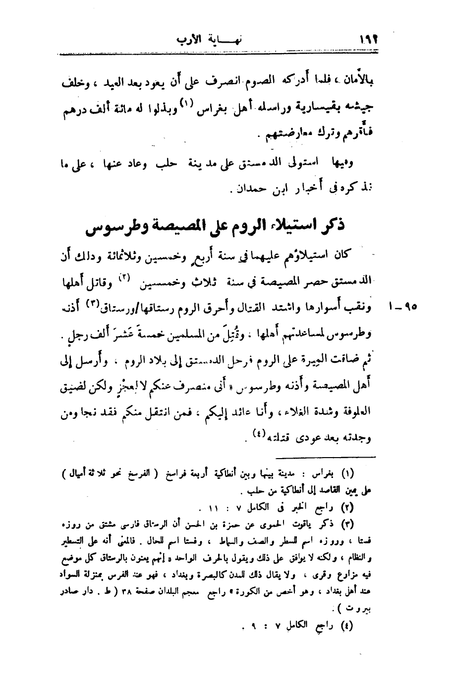 كان استيلاؤهم عليهما فى سنة أربع وخمسين وثلاثمائة وذلك أن الدمستق حصر المصيصة فى سنة ثلاث وخمسين «2» وقاتل أهلها ونقب أسوارها واشتد القتال وأحرق الروم رستاقها/ ورستاق «3» أذنه وطرسوس لمساعدتهم أهلها، وقتل من المسلمين خمسة عشر ألف رجل.