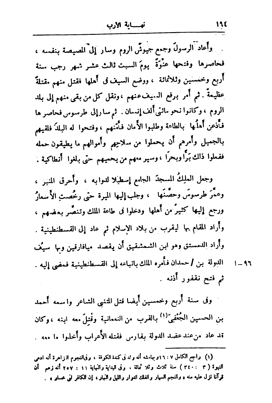 وأعاد الرسول وجمع جيوش الروم وسار إلى المصيصة بنفسه، فحاصرها وفتحها عنوة يوم السبت ثالث عشر شهر رجب سنة أربع وخمسين وثلاثمائة، ووضع السيف فى أهلها فقتل منهم مقتلة عظيمة. ثم أمر برفع السيف عنهم، ونقل كل من بقى منهم إلى بلد الروم، وكانوا نحو سائتى ألف إنسان. ثم سار إلى طرسوس فحاصرها فأذعن أهلها بالطاعة وطلبوا الأمان فأمّنهم، وفتحوا له البلد فلقيهم بالجميل وأمرهم أن يحملوا من سلاحهم وأموالهم ما يطيقون حمله ففعلوا ذلك برّا وبحرا، وسير معهم من يحميهم حتى بلغوا أنطاكية.
