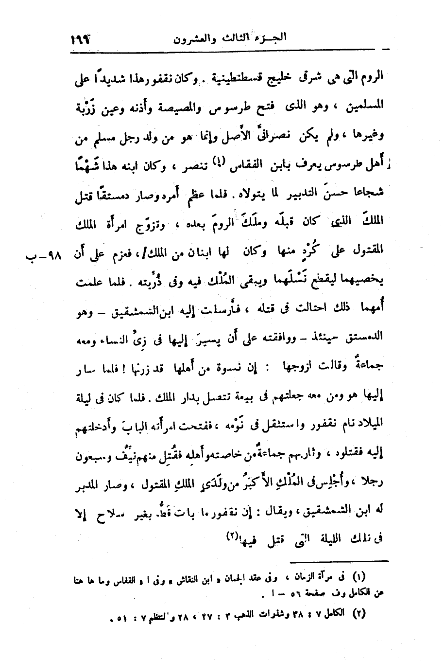 الروم التى هى شرقى خليج قسطنطينية. وكان نقفور هذا شديدا على المسلمين، وهو الذى فتح طرسوس والمصيصة وأذنه وعين زربة وغيرها، ولم يكن نصرانىّ الأصل وإنما هو من ولد رجل مسلم من أهل طرسوس يعرف بابن الفقاس «1» تنصر، وكان ابنه هذا شهما شجاعا حسن التدبير لما يتولاه. فلما عظم أمره وصار دمستقا قتل الملك الذى كان قبله وملك الروم بعده، وتزوّج امرأة الملك المقتول على كره منها وكان لها ابنان من الملك/، فعزم على أن يخصيهما ليقطع نسلهما ويبقى الملك فيه وفى ذرّيته. فلما علمت أمهما ذلك احتالت فى قتله، فأرسلت إليه ابن الشمشقيق- وهو الدمستق حينئذ- ووافقته على أن يسير إليها فى زىّ النساء ومعه جماعة وقالت لزوجها: إن نسوة من أهلها قد زرنها! فلما سار إليها هو ومن معه جعلتهم فى بيعة تتصل بدار الملك. فلما كان فى ليلة الميلاد نام نقفور واستثقل فى نومه، ففتحت امرأته الباب وأدخلتهم إليه فقتلوه، وثاربهم جماعة من خاصته وأهله فقتل منهم نيّف وسبعون رجلا، وأجلس فى الملك الأكبر من ولدى الملك المقتول، وصار المدبر له ابن الشمشقيق، ويقال: إن نقفور ما بات قطّ بغير سلاح إلا فى تلك الليلة التى قتل فيها «2»