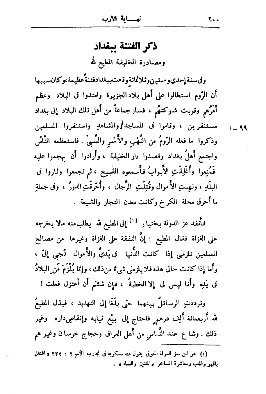 وفى سنة إحدى وستين وثلاثمائة وقعت ببغداد فتنة عظيمة، وكان سببها أن الرّوم استطالوا على أهل بلاد الجزيرة وامتدوا فى البلاد وعظم أمرهم وقويت شوكتهم، فسار جماعة من أهل تلك البلاد إلى بغداد مستنفرين، وقاموا فى المساجد/ والمشاهد واستنفروا المسلمين وذكروا ما فعله الرّوم من النّهب والأسر والسّبى. فاستعظمه النّاس واجتمع أهل بغداد وقصدوا دار الخليفة، وأرادوا أن يهجموا عليه فمنعوا وأغلقت الأبواب فأسمعوه القبيح، ثم تجمعوا وثاروا فى البلد، ونهبت الأموال وقتلت الرّجال، وأحرقت الدور، وفى جملة ما أحرق محلة الكرخ وكانت معدن التجار والشيعة.