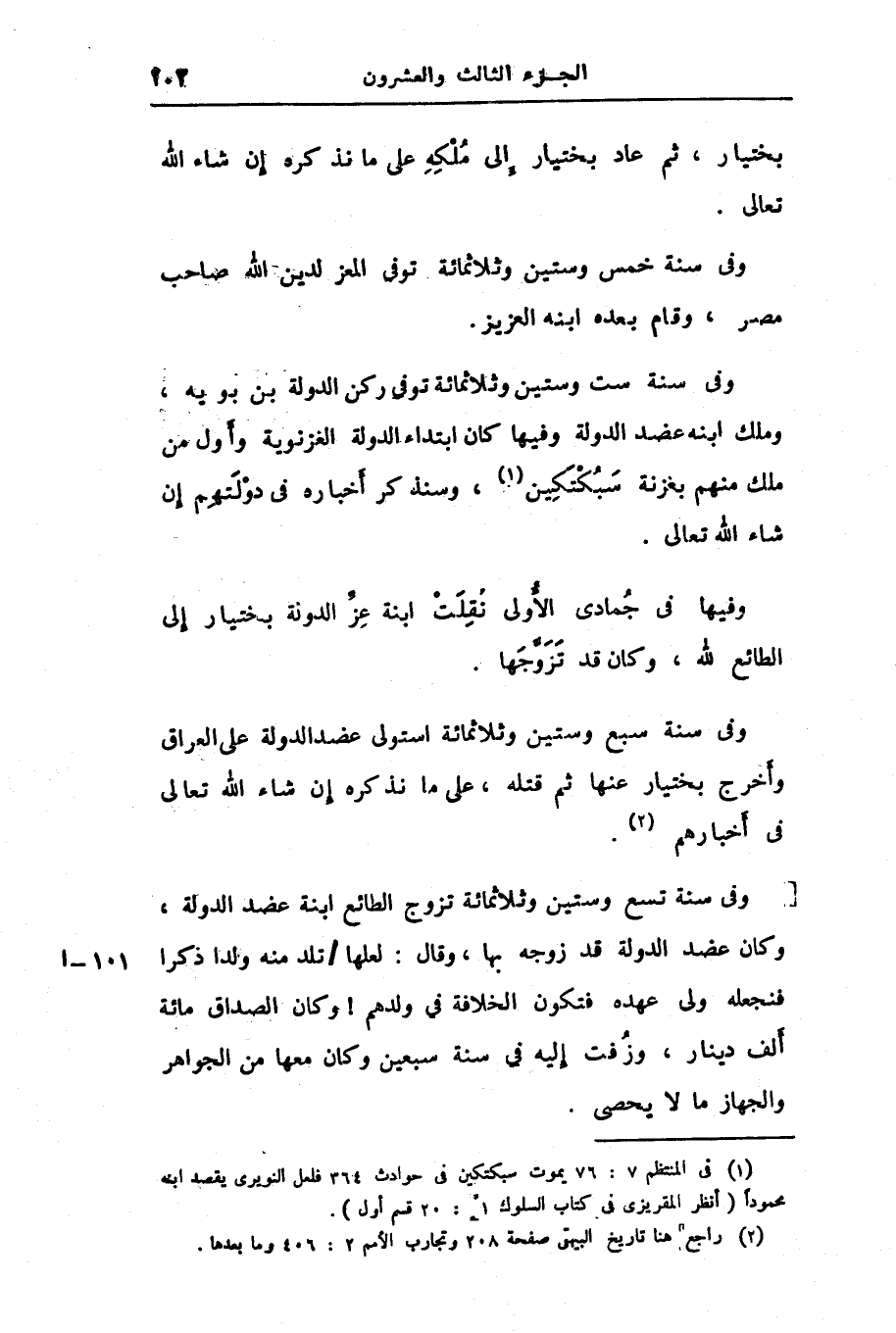 وفى سنة ست وستين وثلاثمائة توفى ركن الدولة بن بويه، وملك ابنه عضد الدولة وفيها كان ابتداء الدولة الغزنوية وأول من ملك منهم بغزنة سبكتكين «1» ، وسنذكر أخباره فى دولتهم إن شاء الله تعالى.
