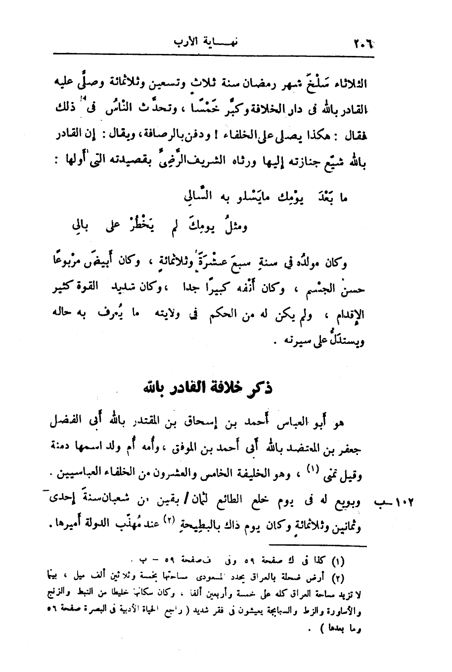 وبويع له فى يوم خلع الطائع لثمان/ بقين من شعبان سنة إحدى وثمانين وثلاثمائة وكان يوم ذاك بالبطيحة «2» عند مهذّب الدولة أميرها.