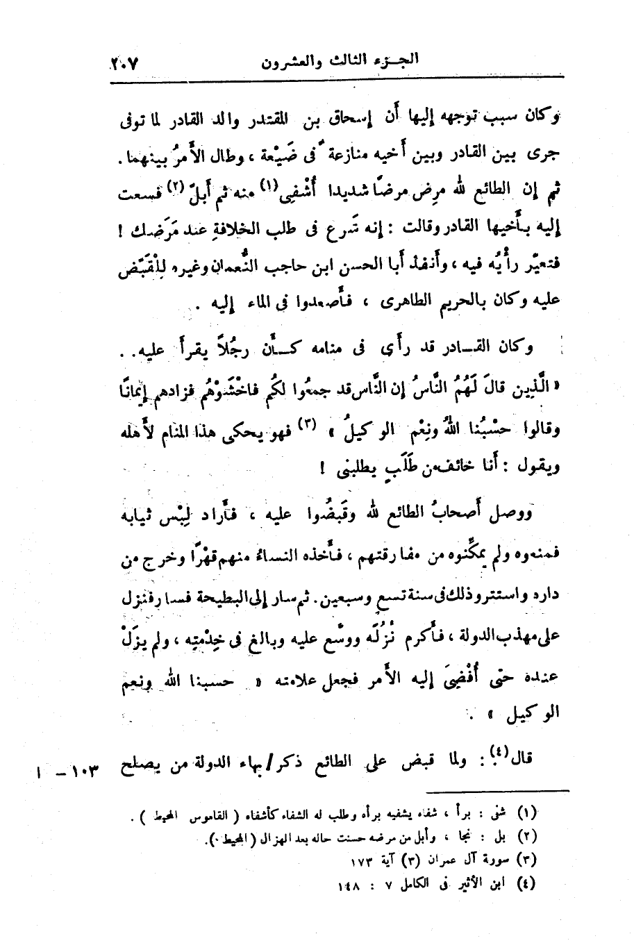 «الّذين قال لهم النّاس إن النّاس قد جمعوا لكم فاخشوهم فزادهم إيمانا وقالوا حسبنا الله ونعم الوكيل» «3» فهو يحكى هذا المنام لأهله ويقول: أنا خائف من طلب يطلبنى! ووصل أصحاب الطائع لله وقبضوا عليه، فأراد لبس ثيابه فمنعوه ولم يمكّنوه من مفارقتهم، فأخذه النساء منهم قهرا وخرج من داره واستتر وذلك فى سنة تسع وسبعين. ثم سار إلى البطيحة فسار فنزل على مهذب الدولة، فأكرم نزله ووسّع عليه وبالغ فى خدمته، ولم يزل عنده حتى أفضى إليه الأمر فجعل علامته «حسبنا الله ونعم الوكيل» .