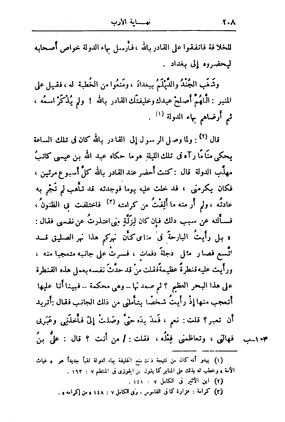 قال «2» : ولما وصل الرسول إلى القادر بالله كان فى تلك الساعة يحكى مناما رآه فى تلك الليلة هو ما حكاه عبد الله بن عيسى كاتب مهذّب الدولة قال: كنت أحضر عند القادر بالله كلّ أسبوع مرتين، فكان يكرمنى، فدخلت عليه يوما فوجدته قد تأهب لم تجر به عادته، ولم أرمنه ما ألفت من كرامته «3» فاختلفت بى الظنون، فسألته عن سبب ذلك فإن كان لزلّة منى اعتذرت عن نفسى فقال: