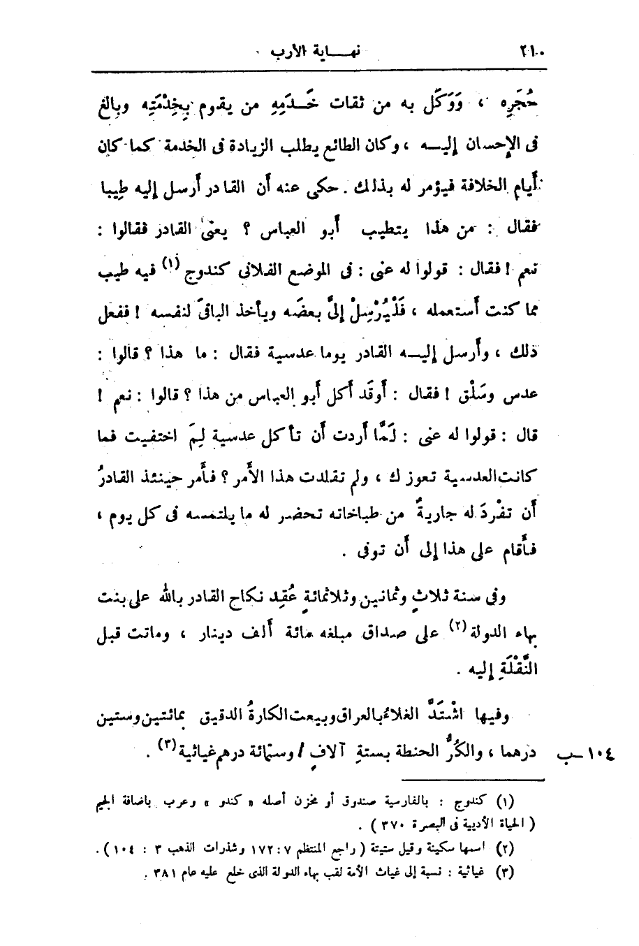 نعم! فقال: قولوا له عنى: فى الموضع الفلانى كندوج «1» فيه طيب مما كنت أستعمله، فليرسل إلىّ بعضه ويأخذ الباقى لنفسه! ففعل ذلك، وأرسل إليه القادر يوما عدسية فقال: ما هذا؟ قالوا: