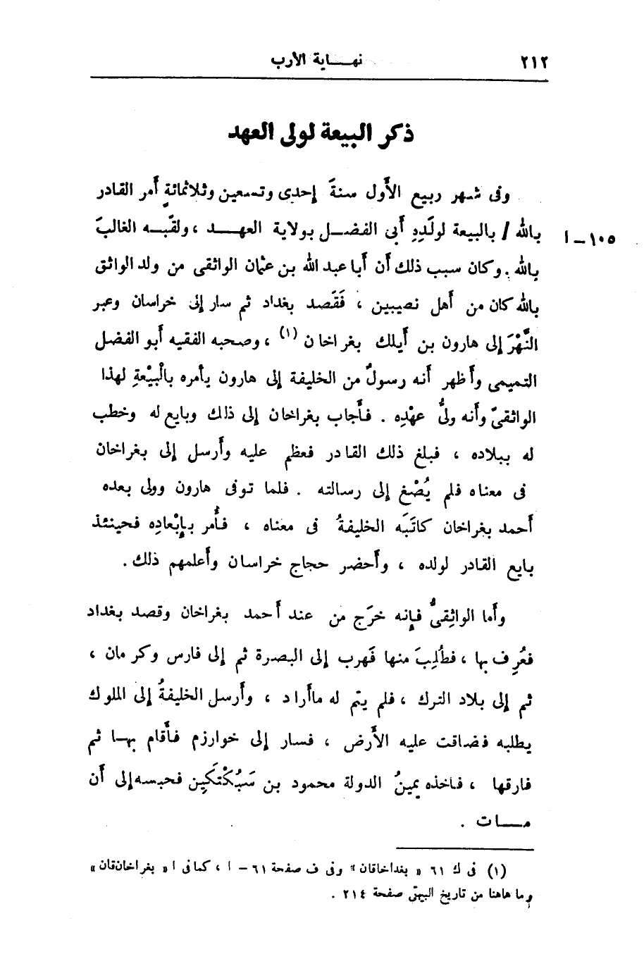وفى شهر ربيع الأول سنة إحدى وتسعين وثلاثمائة أمر القادر بالله/ بالبيعة لولده أبى الفضل بولاية العهد، ولقّبه الغالب بالله. وكان سبب ذلك أن أبا عبد الله بن عثمان الواثقى من ولد الواثق بالله كان من أهل نصيبين، فقصد بغداد ثم سار إلى خراسان وعبر النّهر إلى هارون بن أيلك بغراخان «1» ، وصحبه الفقيه أبو الفضل التميمى وأظهر أنه رسول من الخليفة إلى هارون يأمره بالبيعة لهذا الواثقىّ وأنه ولىّ عهده. فأجاب بغراخان إلى ذلك وبايع له وخطب له ببلاده، فبلغ ذلك القادر فعظم عليه وأرسل إلى بغراخان فى معناه فلم يصغ إلى رسالته. فلما توفى هارون وولى بعده أحمد بغراخان كاتبه الخليفة فى معناه، فأمر بإبعاده فحينئذ بايع القادر لولده، وأحضر حجاج خراسان وأعلمهم ذلك.