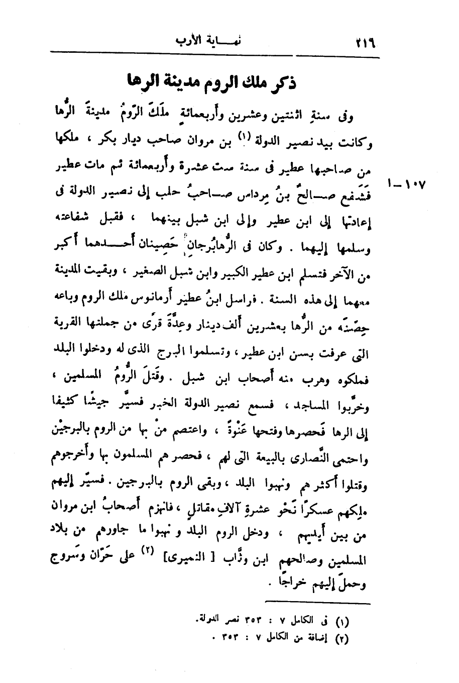 وفى سنة اثنتين وعشرين وأربعمائة ملك الرّوم مدينة الرّها وكانت بيد نصير الدولة «1» بن مروان صاحب ديار بكر، ملكها من صاحبها عطير فى سنة ست عشرة وأربعمائة ثم مات عطير فشفع صالح بن مرداس صاحب حلب إلى نصير الدولة فى إعادتها إلى ابن عطير وإلى ابن شبل بينهما، فقبل شفاعته وسلمها إليهما. وكان فى الرّهابرجان حصينان أحدهما أكبر من الآخر فتسلم ابن عطير الكبير وابن شبل الصغير، وبقيت المدينة معهما إلى هذه السنة. فراسل ابن عطير أرمانوس ملك الروم وباعه حصّنه من الرّها بعشرين ألف دينار وعدّة قرى من جملتها القرية التى عرفت بسن ابن عطير، وتسلموا البرج الذى له ودخلوا البلد فملكوه وهرب منه أصحاب ابن شبل. وقتل الرّوم المسلمين، وخرّبوا المساجد، فسمع نصير الدولة الخبر فسيّر جيشا كثيفا إلى الرها فحصرها وفتحها عنوة، واعتصم من بها من الروم بالبرجين واحتمى النّصارى بالبيعة التى لهم، فحصرهم المسلمون بها وأخرجوهم وقتلوا أكثرهم ونهبوا البلد، وبقى الروم بالبرجين. فسيّر إليهم ملكهم عسكرا نحو عشرة آلاف مقاتل، فانهزم أصحاب ابن مروان من بين أيديهم، ودخل الروم البلد ونهبوا ما جاورهم من بلاد المسلمين وصالحهم ابن وثّاب [النميرى] «2» على حرّان وسروج وحمل إليهم خراجا.