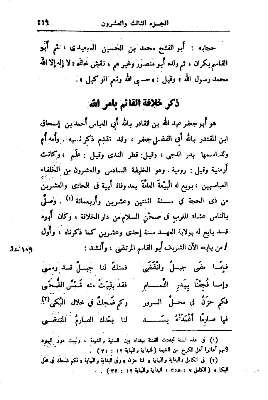 هو أبو جعفر عبد الله بن القادر بالله أبى العباس أحمد بن إسحاق ابن المقتدر بالله أبى الفضل جعفر، وقد تقدم ذكر نسبه. وأمه أم ولد اسمها بدر الدجى، وقيل: قطر الندى وقيل: علم، وكانت أرمنية وقيل: رومية. وهو الخليفة السادس والعشرون من الخلفاء العباسيين، بويع له البيعة العامّة بعد وفاة أبية فى الحادى والعشرين من ذى الحجة فى سنة اثنتين وعشرين وأربعمائة «1» . وصلّى بالناس عشاء المغرب فى صحن السلام من دار الخلافة، وكان أبوه قد بايع له بولاية العهد سنة إحدى وعشرين كما ذكرناه، وأول/ من بايعه الآن الشريف أبو القاسم المرتضى، وأنشد: