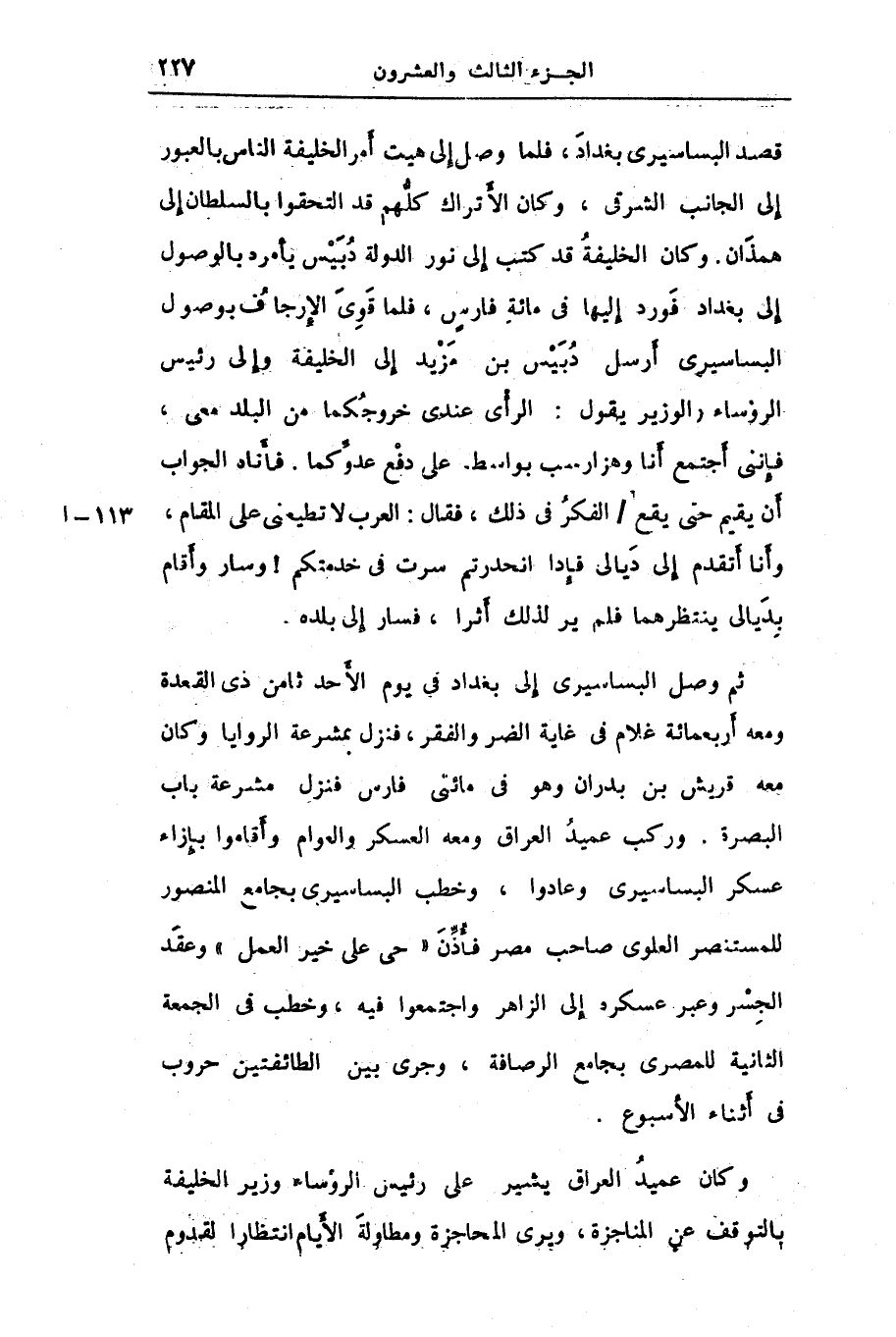 ثم وصل البساسيرى إلى بغداد فى يوم الأحد ثامن ذى القعدة ومعه أربعمائة غلام فى غاية الضر والفقر، فنزل بمشرعة الروايا وكان معه قريش بن بدران وهو فى مائتى فارس فنزل مشرعة باب البصرة. وركب عميد العراق ومعه العسكر والعوام وأقاموا بإزاء عسكر البساسيرى وعادوا، وخطب البساسيرى بجامع المنصور للمستنصر العلوى صاحب مصر فأذّن «حى على خير العمل» وعقد الجسر وعبر عسكره إلى الزاهر واجتمعوا فيه، وخطب فى الجمعة الثانية للمصرى بجامع الرصافة، وجرى بين الطائفتين حروب فى أثناء الأسبوع.