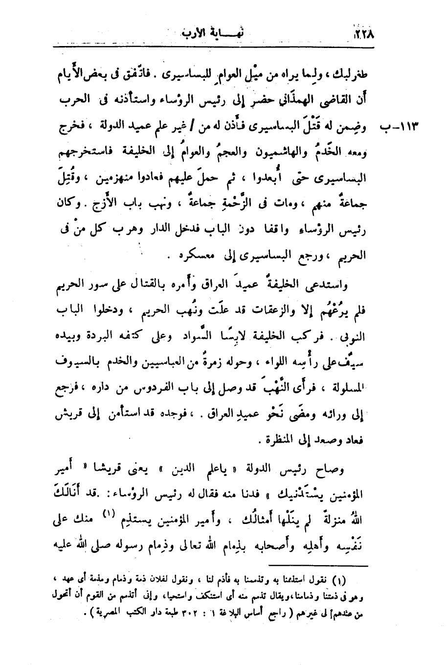 طغرلبك، ولما يراه من ميل العوام للبساسيرى. فاتّفق فى بعض الأيام أن القاضى الهمذانى حضر إلى رئيس الرؤساء واستأذنه فى الحرب وضمن له قتل البساسيرى فأذن له من/ غير علم عميد الدولة، فخرج ومعه الخدم والهاشميون والعجم والعوام إلى الخليفة فاستخرجهم البساسيرى حتى أبعدوا، ثم حمل عليهم فعادوا منهزمين، وقتل جماعة منهم، ومات فى الزّحمة جماعة، ونهب باب الأزج. وكان رئيس الرؤساء واقفا دون الباب فدخل الدار وهرب كل من فى الحريم، ورجع البساسيرى إلى معسكره.
