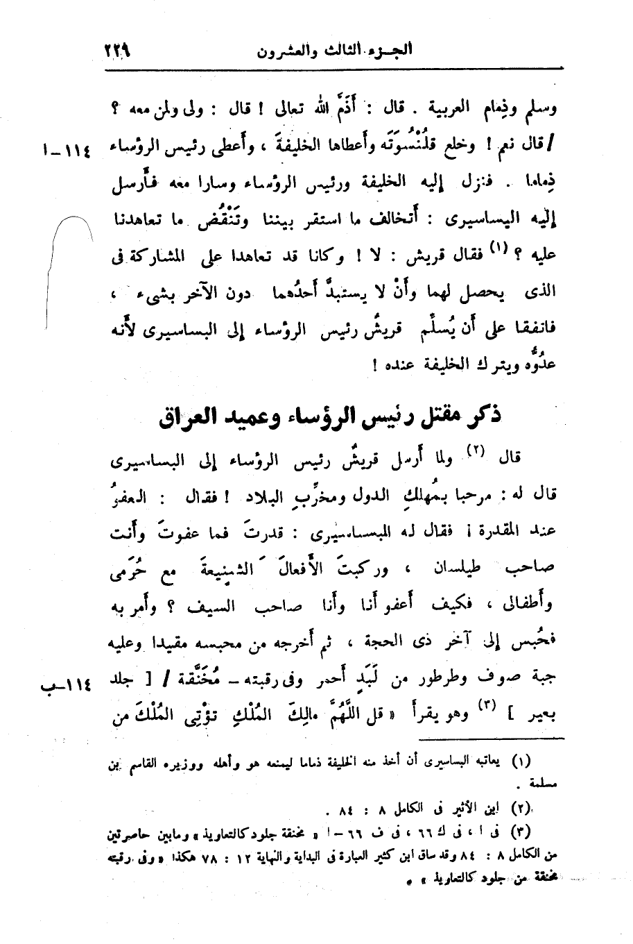 / قال نعم! وخلع قلنسوته وأعطاها الخليفة، وأعطى رئيس الرؤساء ذماما. فنزل إليه الخليفة ورئيس الرؤساء وسارا معه فأرسل إليه اليساسيرى: أتخالف ما استقر بيننا وتنقض ما تعاهدنا عليه؟ «1» فقال قريش: لا! وكانا قد تعاهدا على المشاركة فى الذى يحصل لهما وأن لا يستبدّ أحدهما دون الآخر بشىء، فاتفقا على أن يسلّم قريش رئيس الرؤساء إلى البساسيرى لأنه عدوّه ويترك الخليفة عنده!