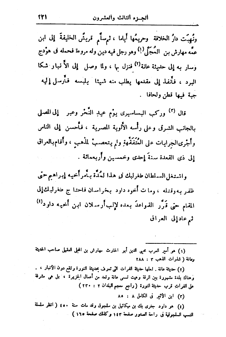 واشتغل السلطان طغرلبك فى هذا لمدّة بأمر أخيه إبراهيم حتى ظفر به وقتله، ومات أخوه داود بخراسان فاحتاج طغرلبك إلى المقام حتى قرّر القواعد بعده لإلب أرسلان ابن أخيه داود «4» ثم عاد إلى العراق