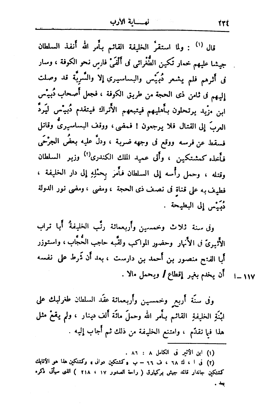 قال «1» : ولما استقرّ الخليفة القائم بأمر الله أنفذ السلطان جيشا عليهم خمار تكين الطّغرائى فى ألفى فارس نحو الكوفة، وسار فى أثرهم فلم يشعر دبيس والبساسيرى إلا والسّريّة قد وصلت إليهم فى ثامن ذى الحجة من طريق الكوفة، فجعل أصحاب دبيس ابن مزيد يرتحلون بأهليهم فيتبعهم الأتراك فيتقدم دبيس ليردّ العرب إلى القتال فلا يرجعون! فمضى، ووقف البساسيرىّ وقاتل فسقط عن فرسه ووقع فى وجهه ضربة، ودلّ عليه بعض الجرحى فأخذه كمشتكين، وأتى عميد الملك الكندرى «2» وزير السلطان وقتله، وحمل رأسه إلى السلطان فأمر بحمله إلى دار الخليفة، فطيف به على قناة فى نصف ذى الحجة، ومضى، ومضى نور الدولة دبيس إلى البطيحة.