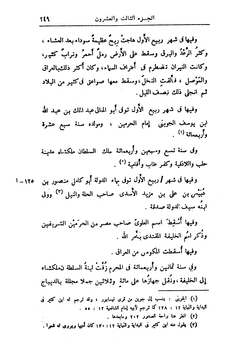 وفيها فى شهر ربيع الأول توفى أبو المعالى عبد الملك بن عبد الله ابن يوسف الجوينى إمام الحرمين، ومولده سنة سبع عشرة وأربعمائة «1» .