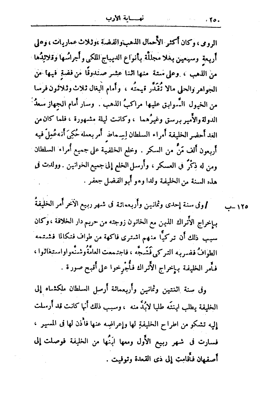 الرومى، وكان أكثر الأحمال الذهب والفضة، وثلاث عماريات، وعلى أربعة وسبعين بغلا مجللّة بأنواع الديباج الملكى وأجراسها وقلائدها من الذهب، وعلى ستة منها اثنا عشر صندوقا من فضة فيها من الجواهر والحلى ما لا تقدّر قيمته، وأمام البغال ثلاث وثلاثون فرسا من الخيول السّوابق عليها مراكب الذهب. وسار أمام الجهاز سعد الدولة والأمير برسق وغيرهما، وكانت ليلة مشهورة، فلما كان من العد أحضر الخليفة أمراء السلطان لسماط أمر بعمله حكى أنه عمل فيه أربعون ألف منّ من السكر. وخلع الخليفة على جميع أمراء السلطان ومن له ذكر فى العسكر، وأرسل الخلع إلى جميع الخواتين. وولدت فى هذه السنة من الخليفة ولدا وهو أبو الفضل جعفر.