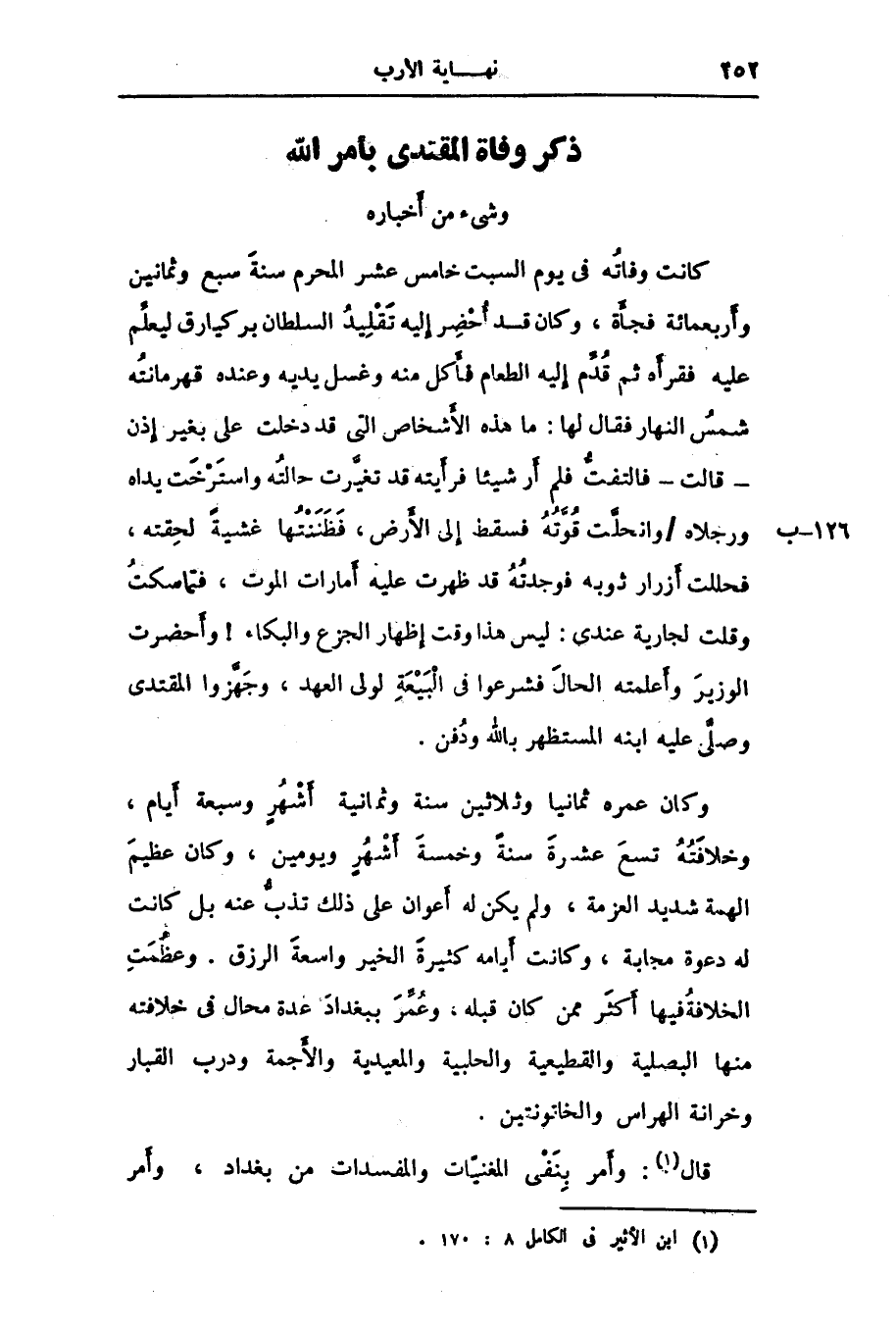 كانت وفاته فى يوم السبت خامس عشر المحرم سنة سبع وثمانين وأربعمائة فجأة، وكان قد أحضر إليه تقليد السلطان بركيارق ليعلّم عليه فقرأه ثم قدّم إليه الطعام فأكل منه وغسل يديه وعنده قهرمانته شمس النهار فقال لها: ما هذه الأشخاص التى قد دخلت على بغير إذن- قالت- فالتفتّ فلم أر شيئا فرأيته قد تغيّرت حالته واسترخت يداه ورجلاه/ وانحلّت قوّته فسقط إلى الأرض، فظننتها غشية لحقته، فحللت أزرار ثوبه فوجدته قد ظهرت عليه أمارات الموت، فتماسكت وقلت لجارية عندى: ليس هذا وقت إظهار الجزع والبكاء! وأحضرت الوزير وأعلمته الحال فشرعوا فى البيعة لولى العهد، وجهّزوا المقتدى وصلّى عليه ابنه المستظهر بالله ودفن.