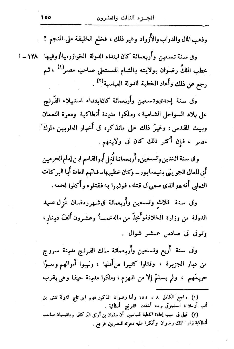 وذهب المال والدواب والأزواد وغير ذلك، فخلع الخليفة على المنجم! وفى سنة تسعين وأربعمائة كان ابتداء الدولة الخوازرمية/ وفيها خطب الملك رضوان بولايته بالشام للمستعلى صاحب مصر «1» ، ثم رجع عن ذلك وأعاد الخطبة للدولة العباسية «2» .