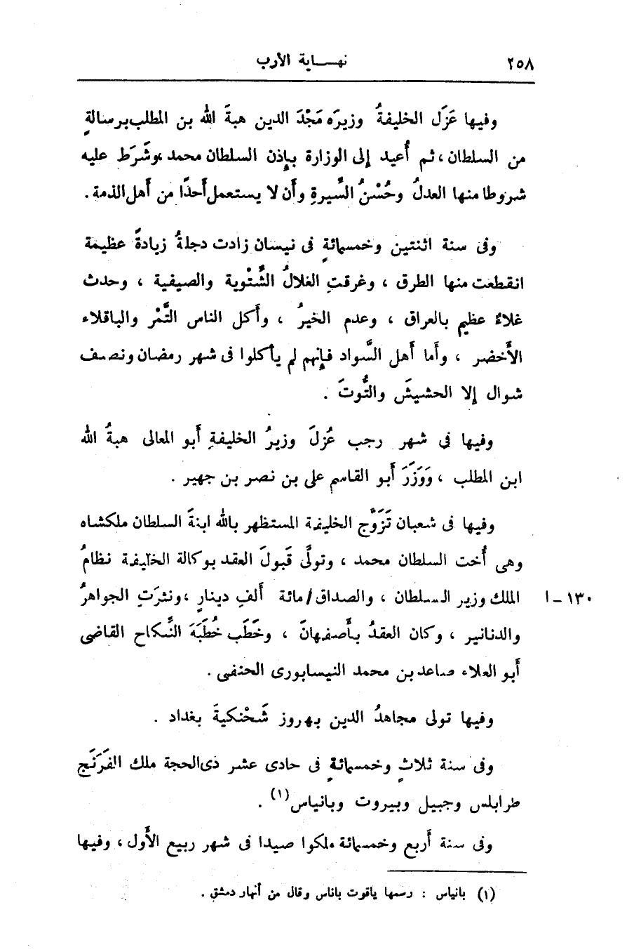وفيها فى شهر رجب عزل وزير الخليفة أبو المعالى هبة الله ابن المطلب، ووزر أبو القاسم على بن نصر بن جهير.