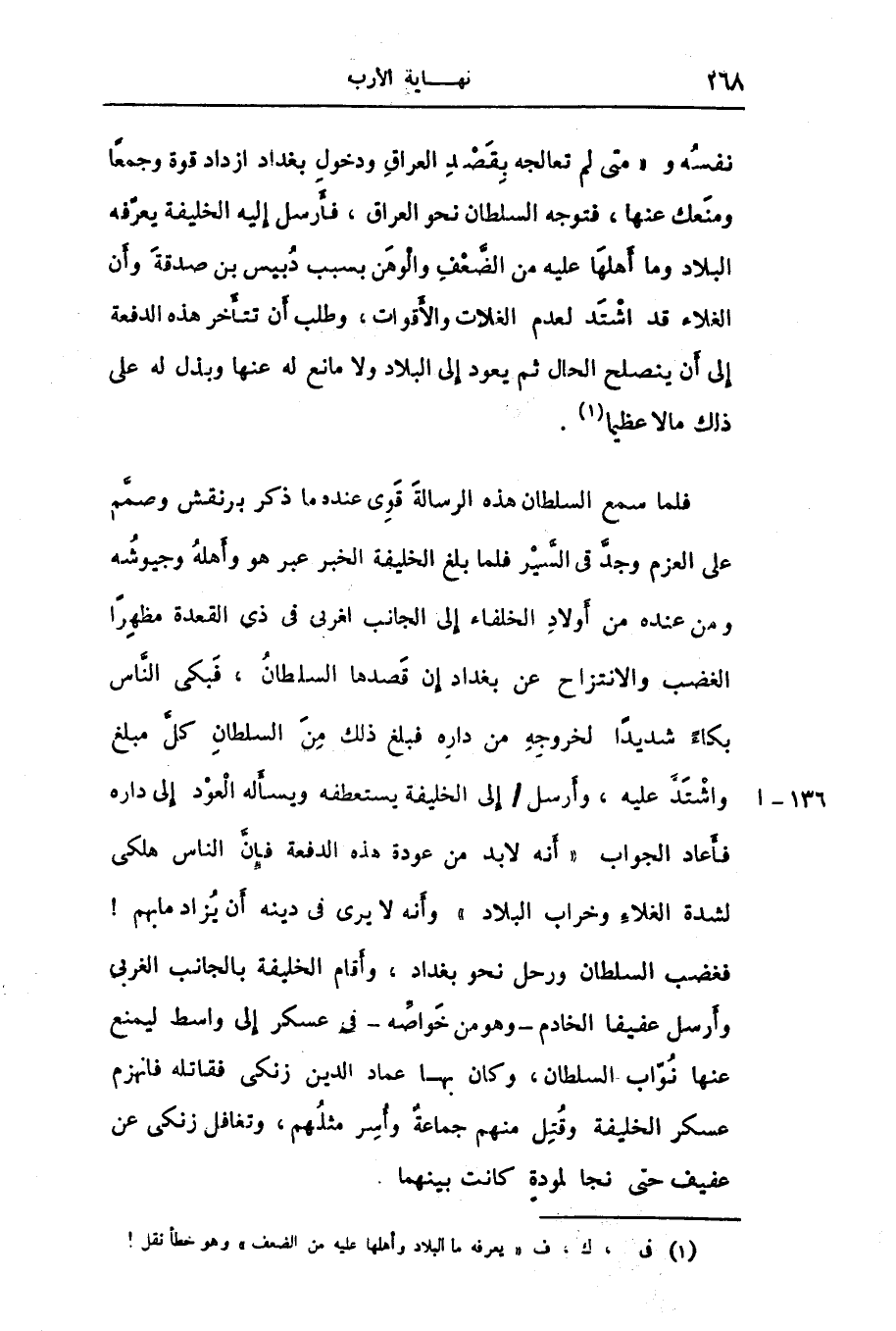 فلما سمع السلطان هذه الرسالة قوى عنده ما ذكر برنقش وصمّم على العزم وجدّ فى السّير فلما بلغ الخليفة الخبر عبر هو وأهله وجيوشه ومن عنده من أولاد الخلفاء إلى الجانب لغربى فى ذى القعدة مظهرا الغضب والانتزاح عن بغداد إن قصدها السلطان، فبكى النّاس بكاء شديدا لخروجه من داره فبلغ ذلك من السلطان كلّ مبلغ واشتدّ عليه، وأرسل/ إلى الخليفة يستعطفه ويسأله العود إلى داره فأعاد الجواب «أنه لا بد من عودة هذه الدفعة فإنّ الناس هلكى لشدة الغلاء وخراب البلاد» وأنه لا يرى فى دينه أن يزاد ما بهم! فغضب السلطان ورحل نحو بغداد، وأقام الخليفة بالجانب الغربى وأرسل عفيفا الخادم- وهو من خواصّه- فى عسكر إلى واسط ليمنع عنها نوّاب السلطان، وكان بها عماد الدين زنكى فقاتله فانهزم عسكر الخليفة وقتل منهم جماعة وأسر مثلهم، وتغافل زنكى عن عفيف حتى نجا لمودة كانت بينهما.