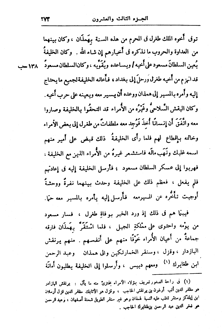 فيبنما هم فى ذلك إذ ورد الخبر بوفاة طغرل، فسار مسعود من يومه واحتوى على مملكة الجبل، فلما استقرّ بهمذان فارقه جماعة من أعيان الأمراء خوفا منهم على أنفسهم. منهم يرنقش البازدار، وقزل، وسنقر الخمارتكين والى همذان وعبد الرحمن ابن طغايرك «1» ومعهم دبيس، وأرسلوا إلى الخليفة يطلبون أمانة