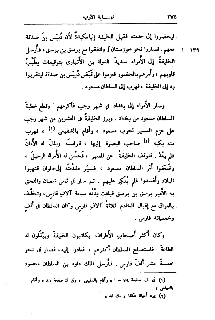 وسار الأمراء إلى بغداد فى شهر رجب فأكرمهم وقطع خطبة السلطان مسعود من بغداد. وبرز الخليفة فى العشرين من شهر رجب على عزم المسير لحرب مسعود، وأقام بالشفيعى «1» ، فهرب منه بكبه «2» صاحب البصرة إليها، فراسله وبذل له الأمان فلم يعد. فتوقف الخليفة عن المسير، فحسّن له الأمراء الرحيل، وضعّفوا أمر السلطان مسعود، فسيّر مقدّمته إلى حلوان فنهبوا البلاد وأفسدوا فلم ينكر عليهم. تم سار فى ثامن شعبان والتحق به الأمير برسق بن برسق فبلغت عدّته سبعة آلاف فارس، وتخلّف بالعراق مع إقبال الخادم ثلاثة آلاف فارس وكان السلطان فى ألف وخمسمائة فارس.