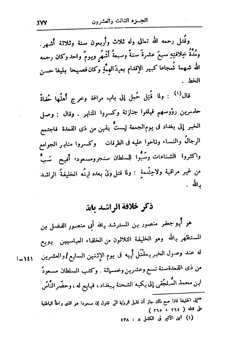 قال «1» : ولما قتل حمل إلى باب مراغة وخرج أهلها حفاة حاسرين رؤوسهم فبلغوا جنازته وكسروا المنابر. وقال: وصل الخبر إلى بغداد فى يوم الجمعة لستّ بقين من ذى القعدة فاجتمع الرجال والنساء وناحوا عليه فى الطرقات وكسروا منابر الجوامع واكثروا الشناعات وسبّوا السلطان سنجر ومسعودا أفبح سبّ من غير مراقبة ولا حشمة: ولما قتل ولى بعده ابنه الخليفة الراشد بالله.