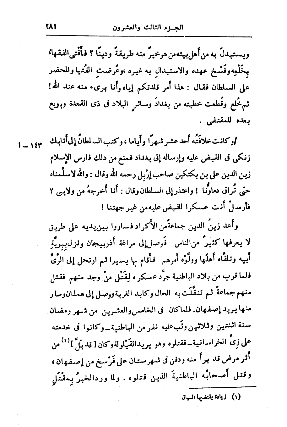 / وكانت خلافته أحد عشر شهرا وأياما، وكتب السلطان إلى أتابك زنكى فى القبض عليه وإرساله إلى بغداد فمنع من ذلك فارس الإسلام زين الدين على بن بكتكين صاحب إربل رحمه الله وقال: والله لا سلّمناه حتى تراق دماؤنا! واعتذر إلى السلطان وقال: أنا أخرجه من ولايى؟