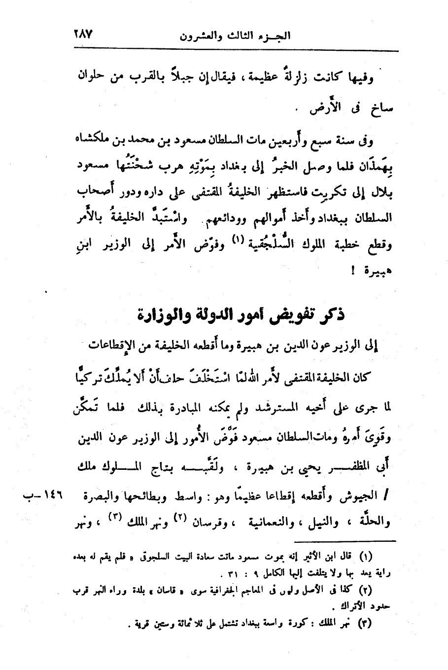 إلى الوزير عون الدين بن هبيرة وما أقطعه الخليفة من الإقطاعات كان الخليفة المقتفى لأمر الله لمّا استخلف حلف أن ألا يملّك تركيّا لما جرى على أخيه المسترشد ولم يمكنه المبادرة بذلك فلما تمكّن وقوى أمره ومات السلطان مسعود فوّض الأمور إلى الوزير عون الدين أبى المظفر يحيى بن هبيرة، ولقّبه بتاج الملوك ملك/ الجيوش وأقطعه إقطاعا عظيما وهو: واسط وبطائحها والبصرة والحلّة، والنيل، والنعمانية، وقرسان «2» ونهر الملك «3» ، ونهر