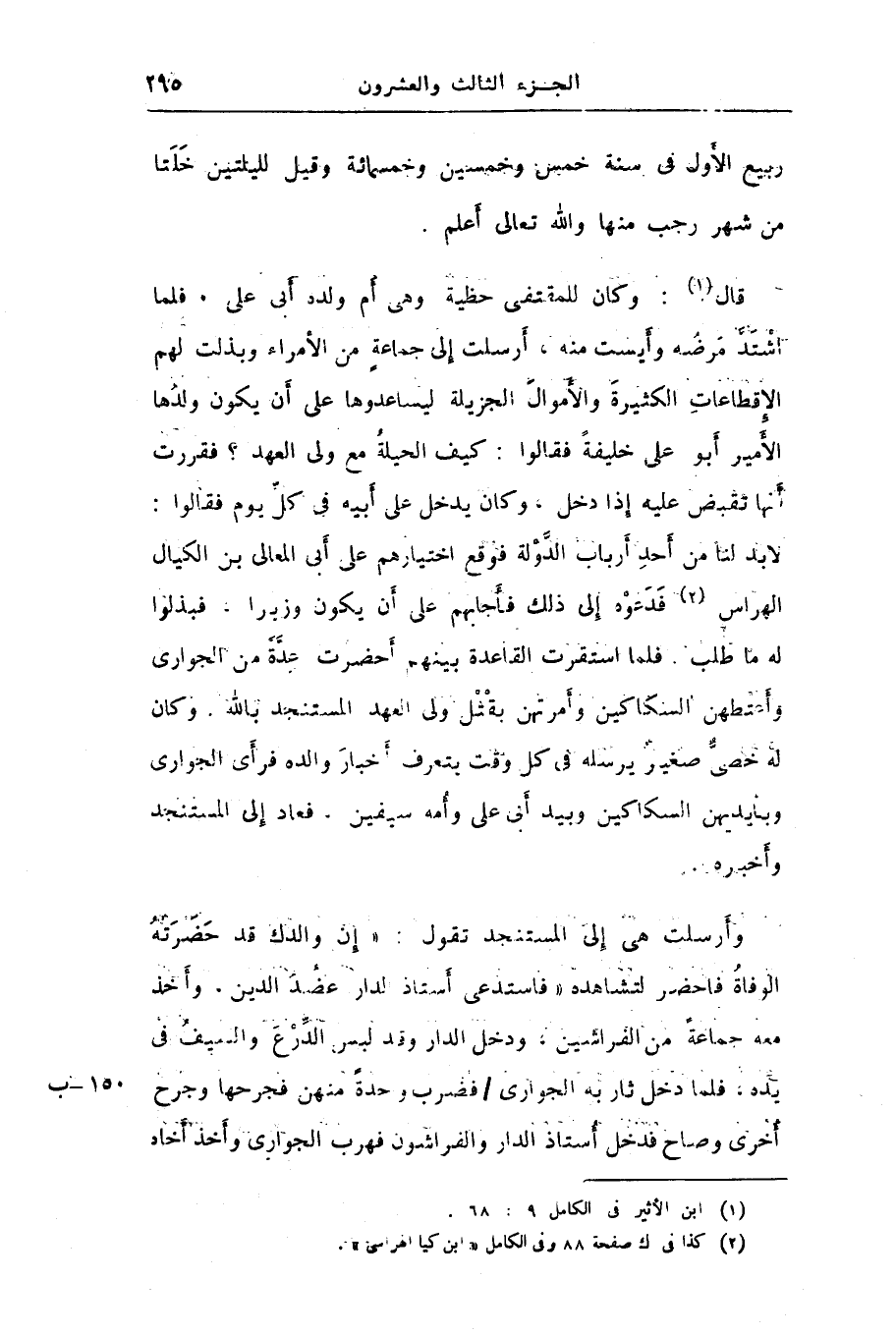 لا بد لنا من أحد أرباب الدّولة فوقع اختيارهم على أبى المعالى بن الكيال الهراس «2» فدعوه إلى ذلك فأجابهم على أن يكون وزيرا. فبذلوا له ما طلب. فلما استقرت القاعدة بينهم أحضرت عدّة من الجوارى وأعتطهن السكاكين وأمرتهن بقتل ولى العهد المستنجد بالله. وكان له خصىّ صغير يرسله فى كل وقت يتعرف أخبار والده فرأى الجوارى وبأيديهن السكاكين وبيد أبى على وأمه سيفين. فعاد إلى المستنجد وأخبره.