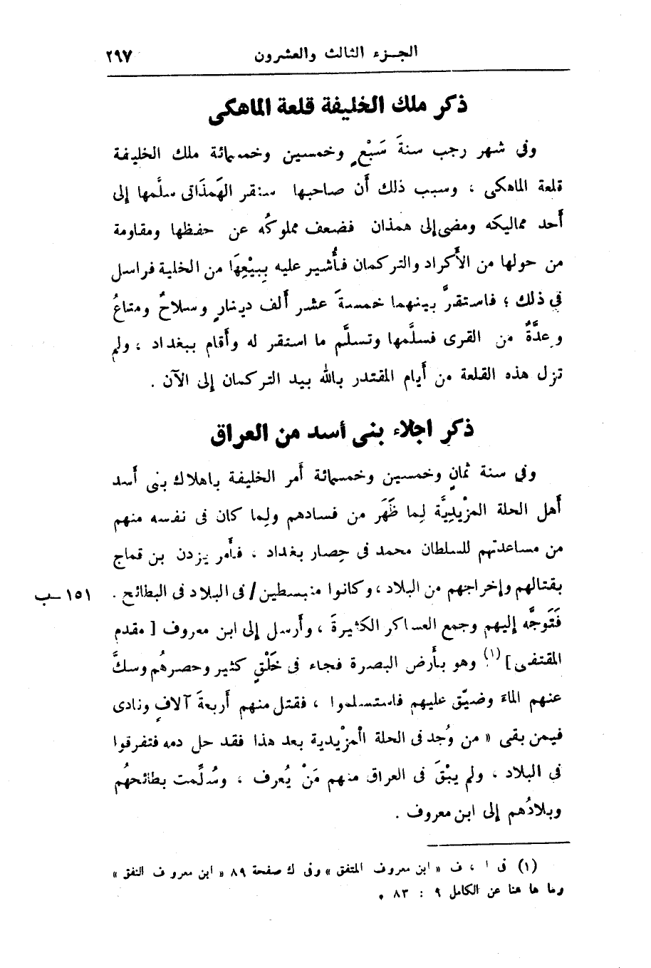وفى سنة ثمان وخمسين وخمسمائة أمر الخليفة باهلاك بنى أسد أهل الحلة المزيديّة لما ظهر من فسادهم ولما كان فى نفسه منهم من مساعدتهم للسلطان محمد فى حصار بغداد، فأمر يزدن بن قماج بقتالهم وإخراجهم من البلاد، وكانوا منبسطين/ فى البلاد فى البطائح.